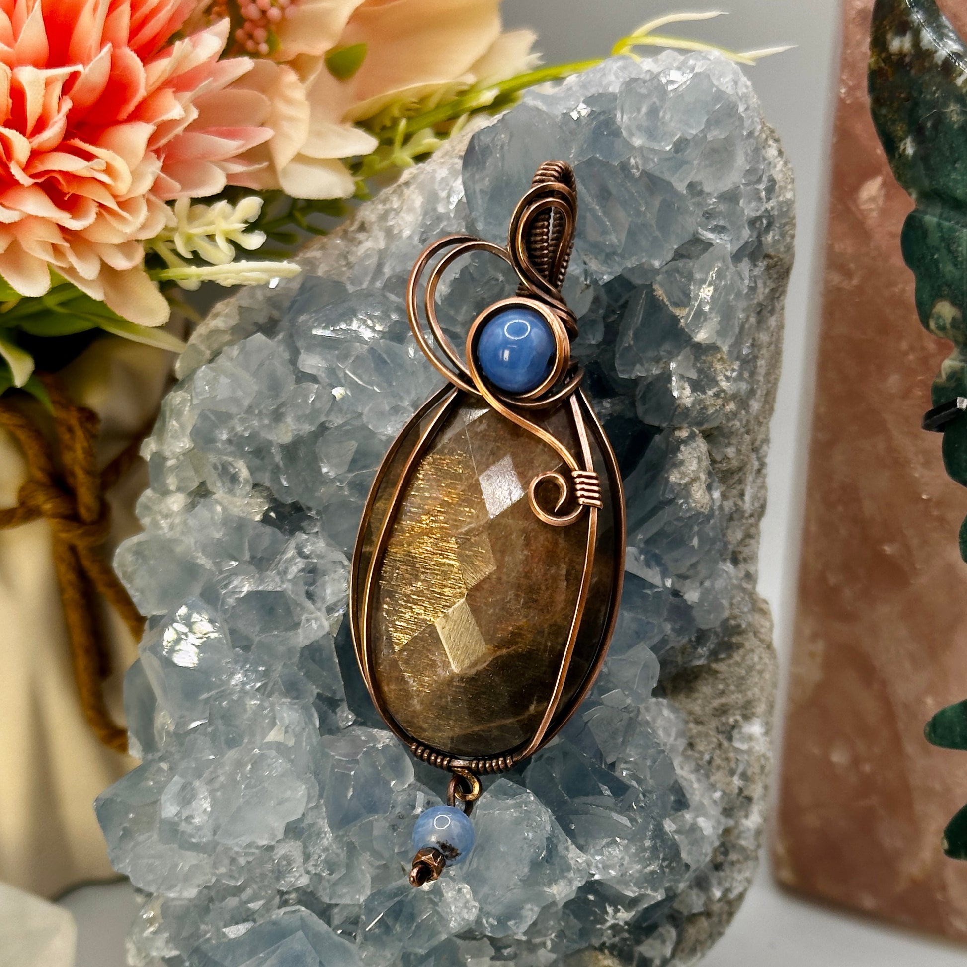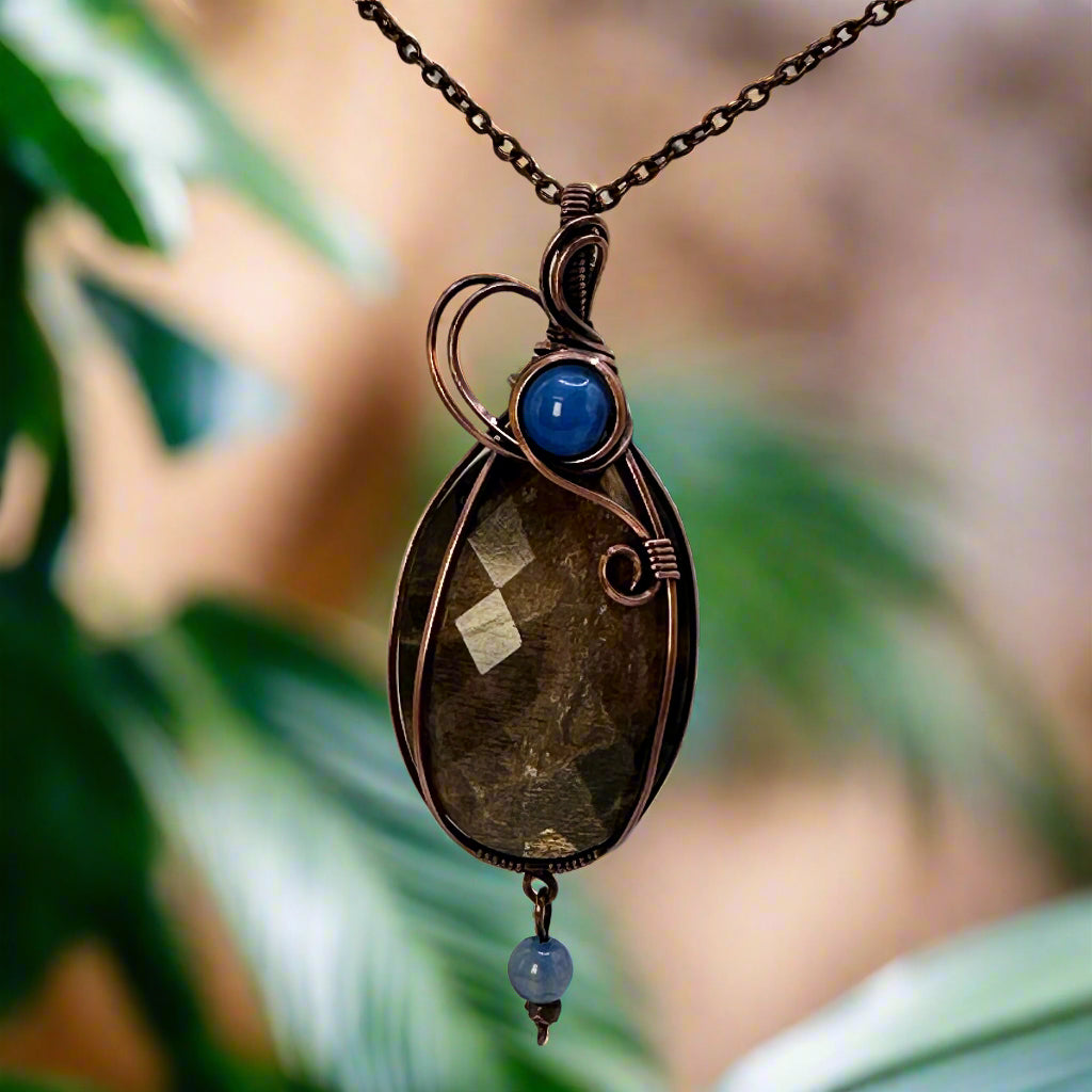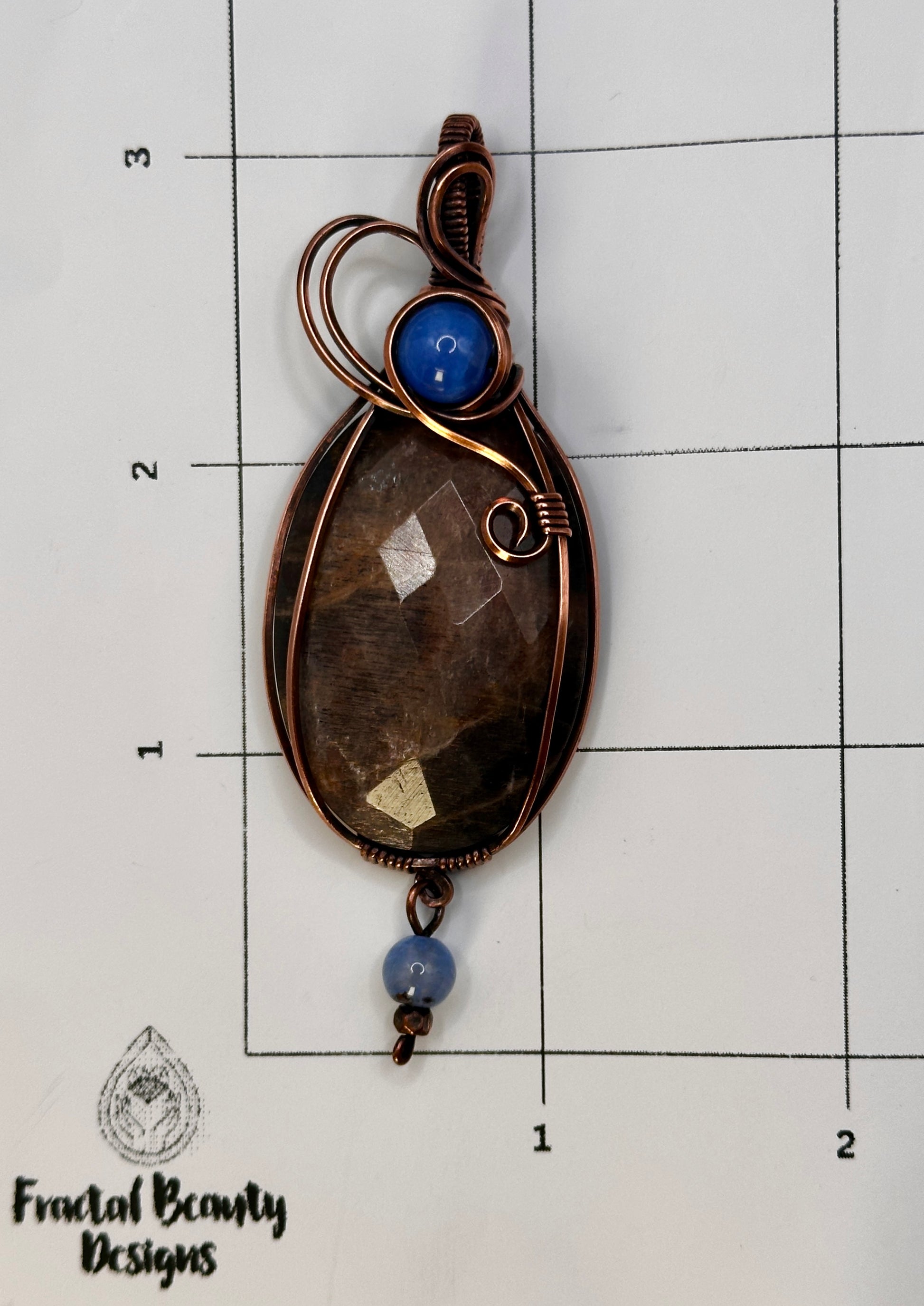 This handmade pendant features a large Rose Cut Oval shaped Black Moonstone wrapped in antiqued copper in a signature swirl design with blue lace agate bead accents!