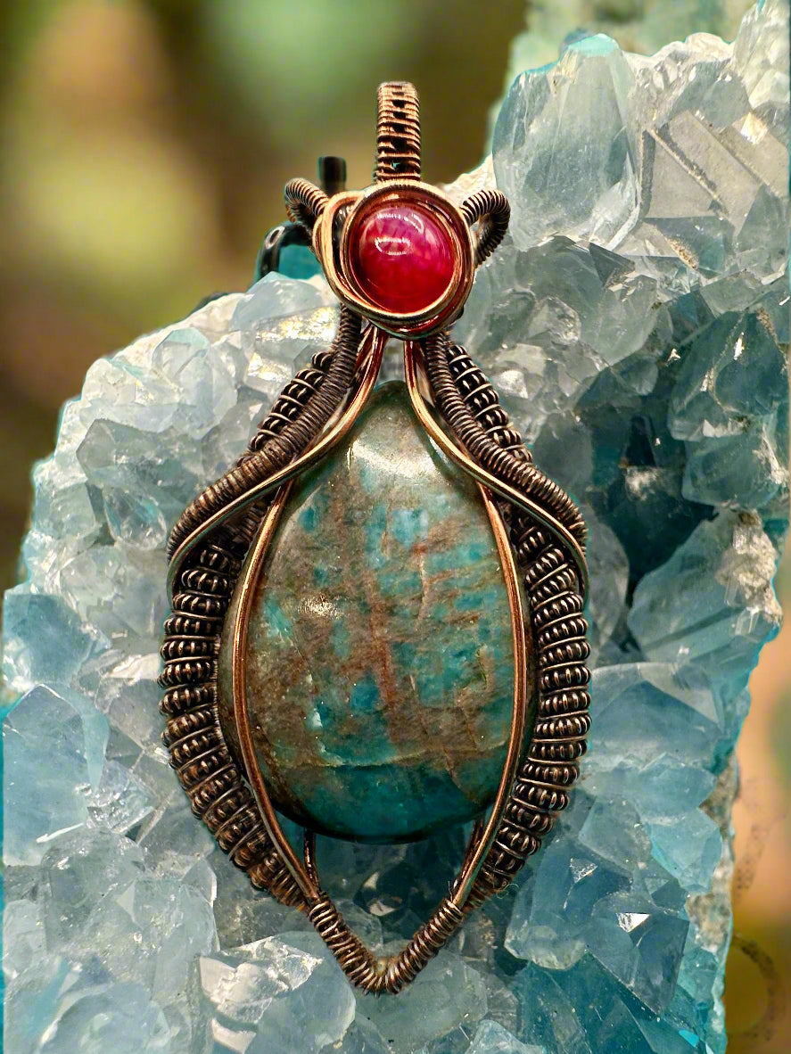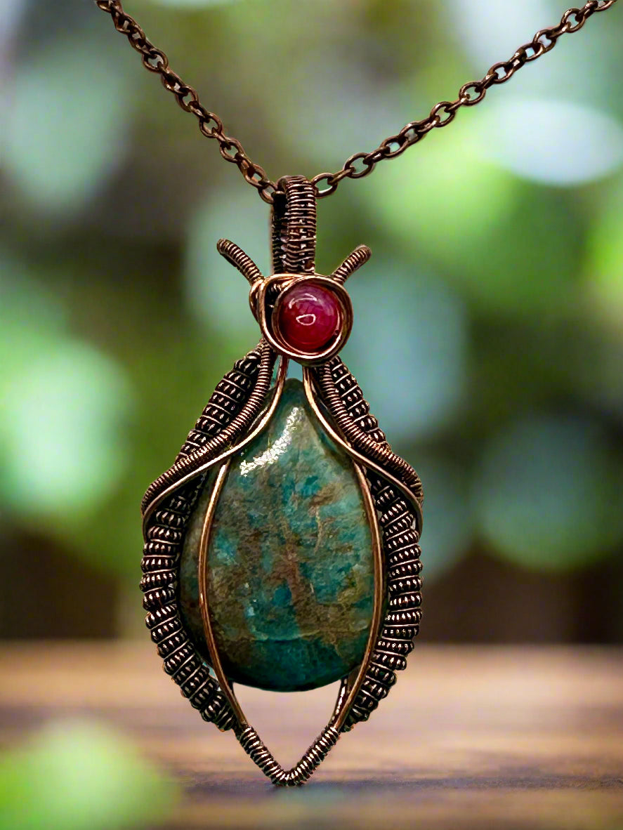 Pear shaped Blue Apatite wrapped in coiled antiqued copper, accented with pinkish red bead.
