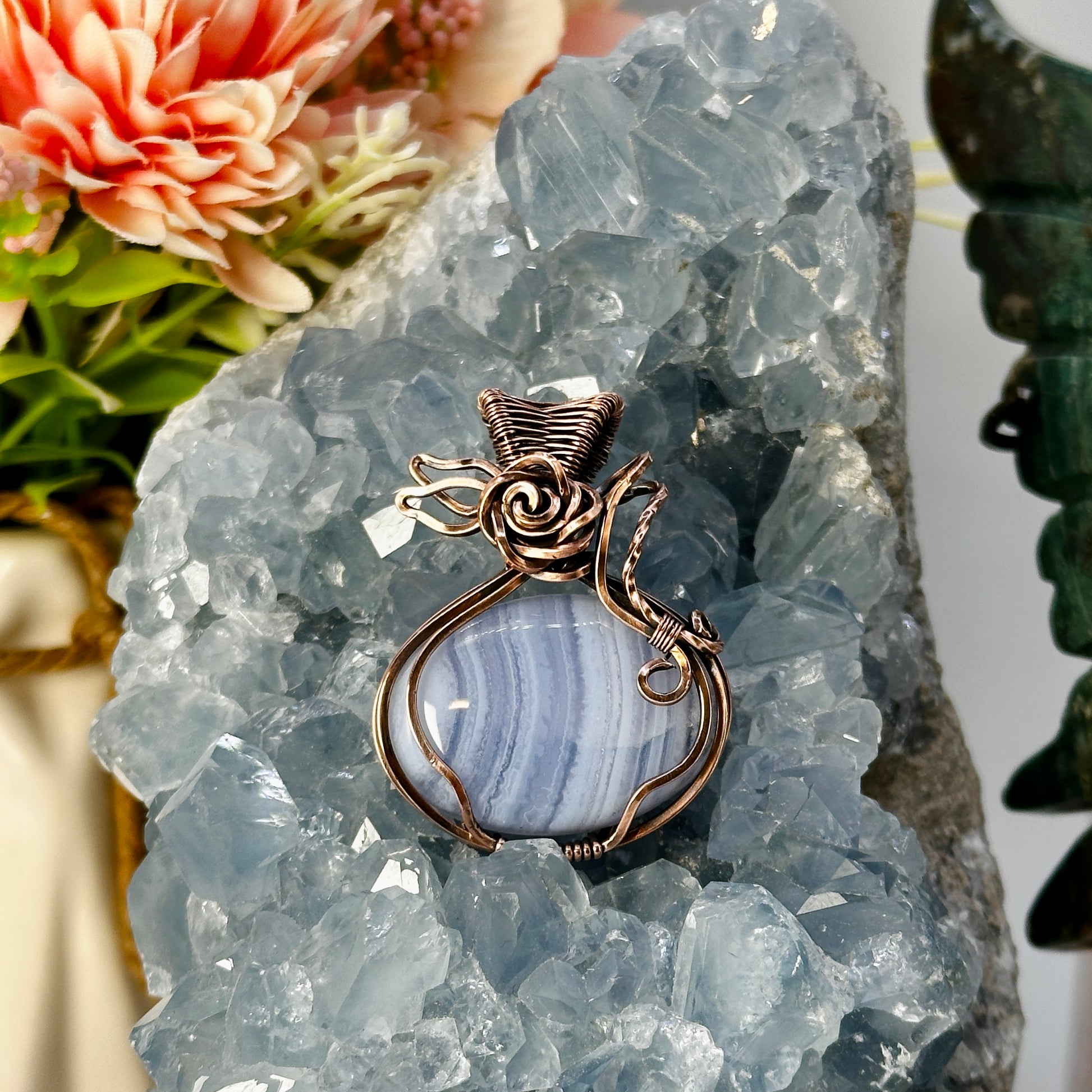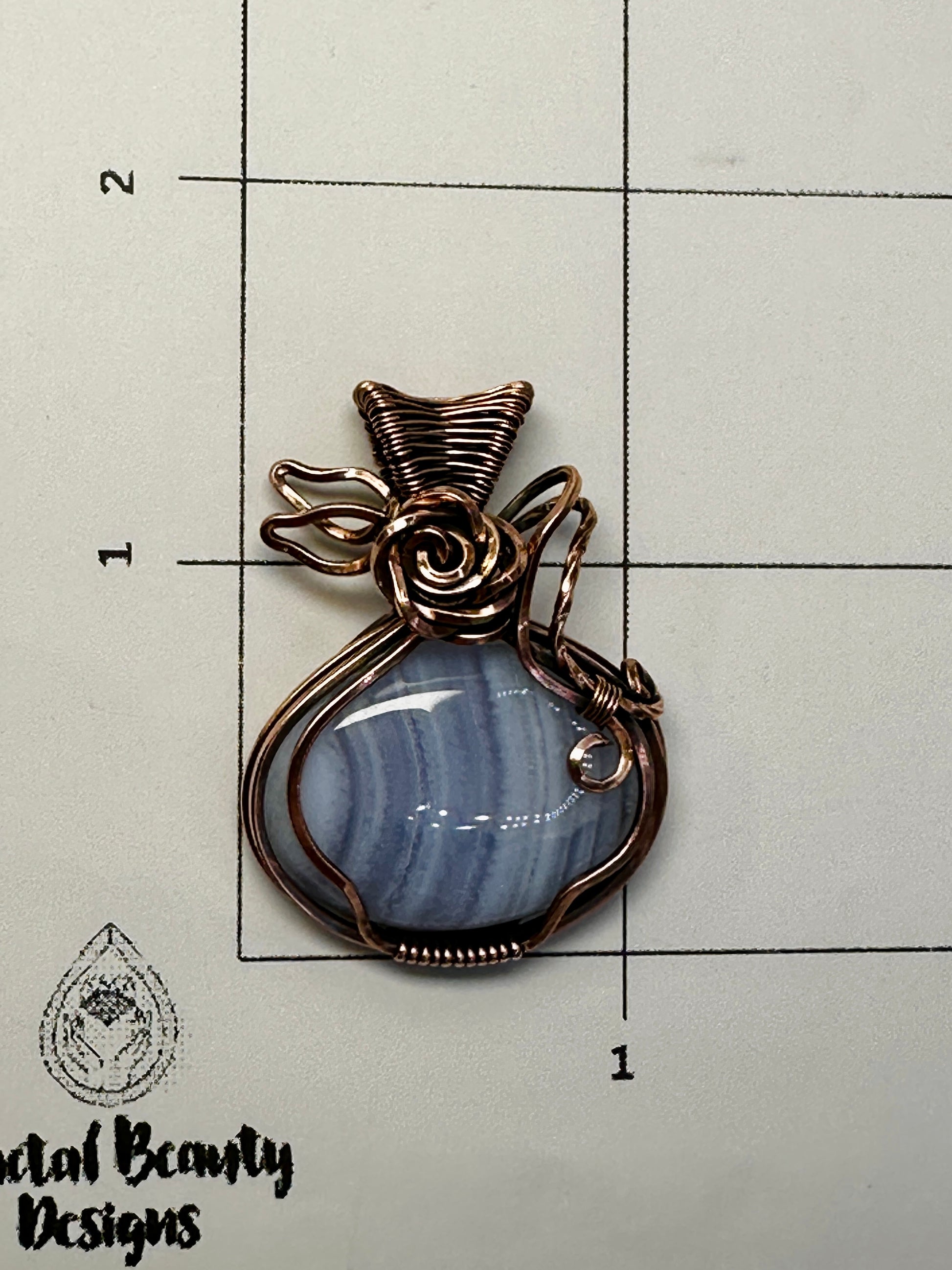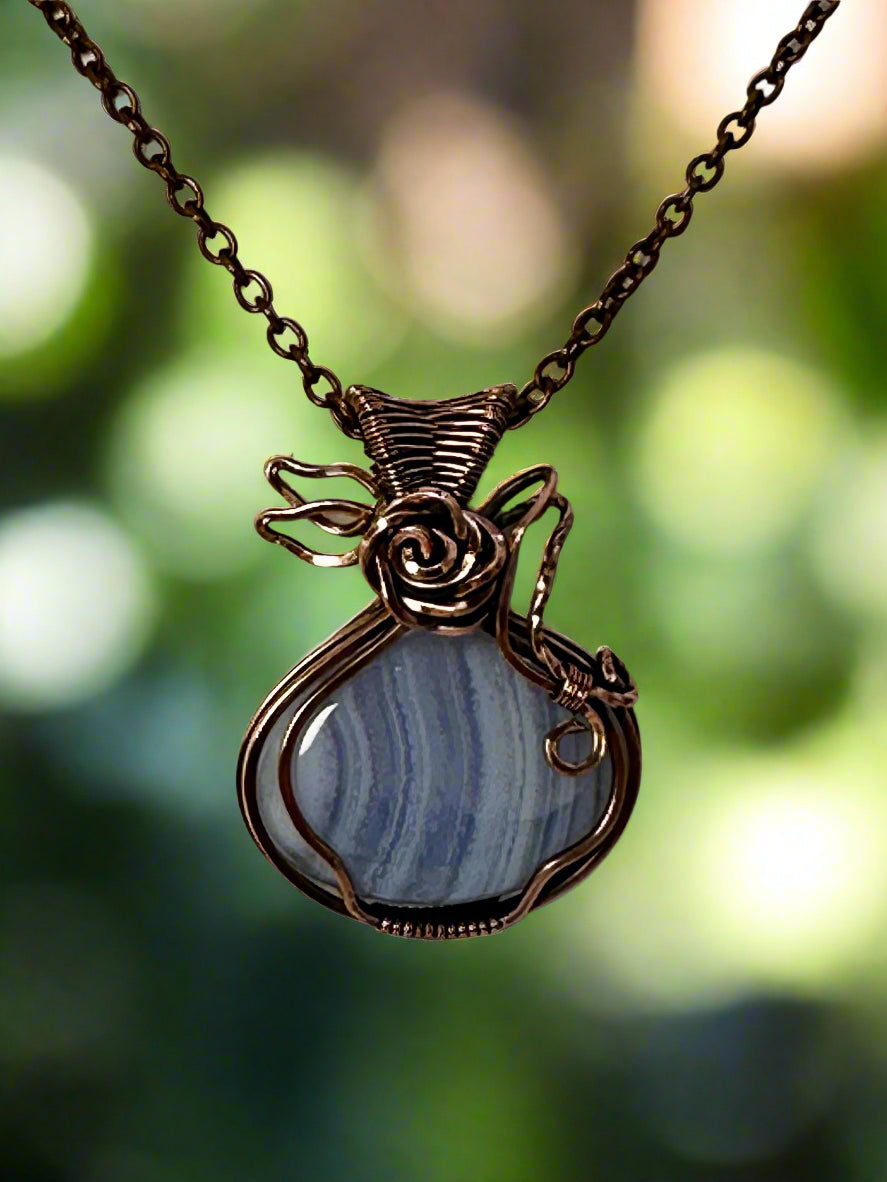 Oval Blue Lace Agate wrapped in antiqued copper accented with a wrapped rose and leaves design.