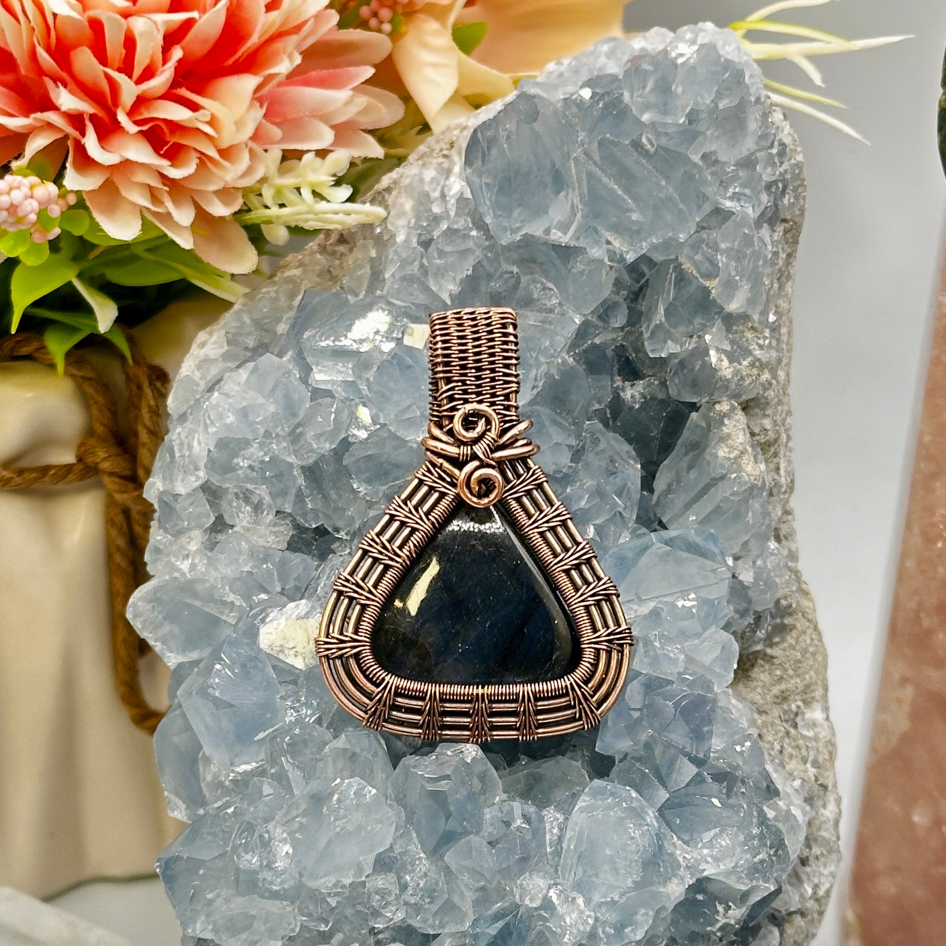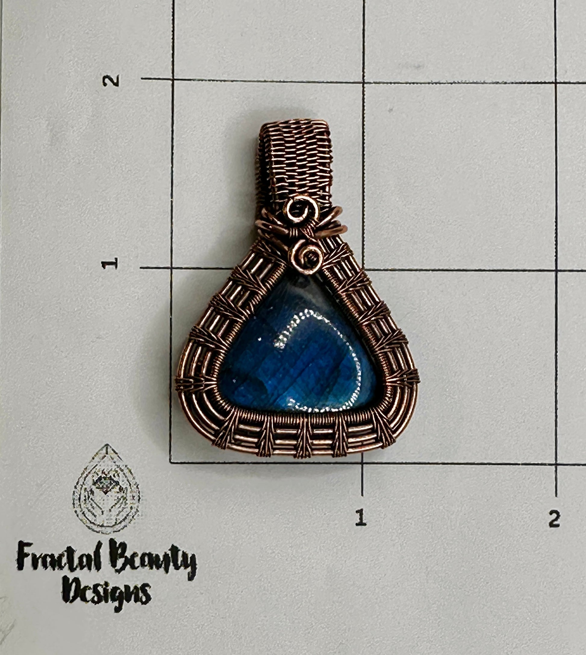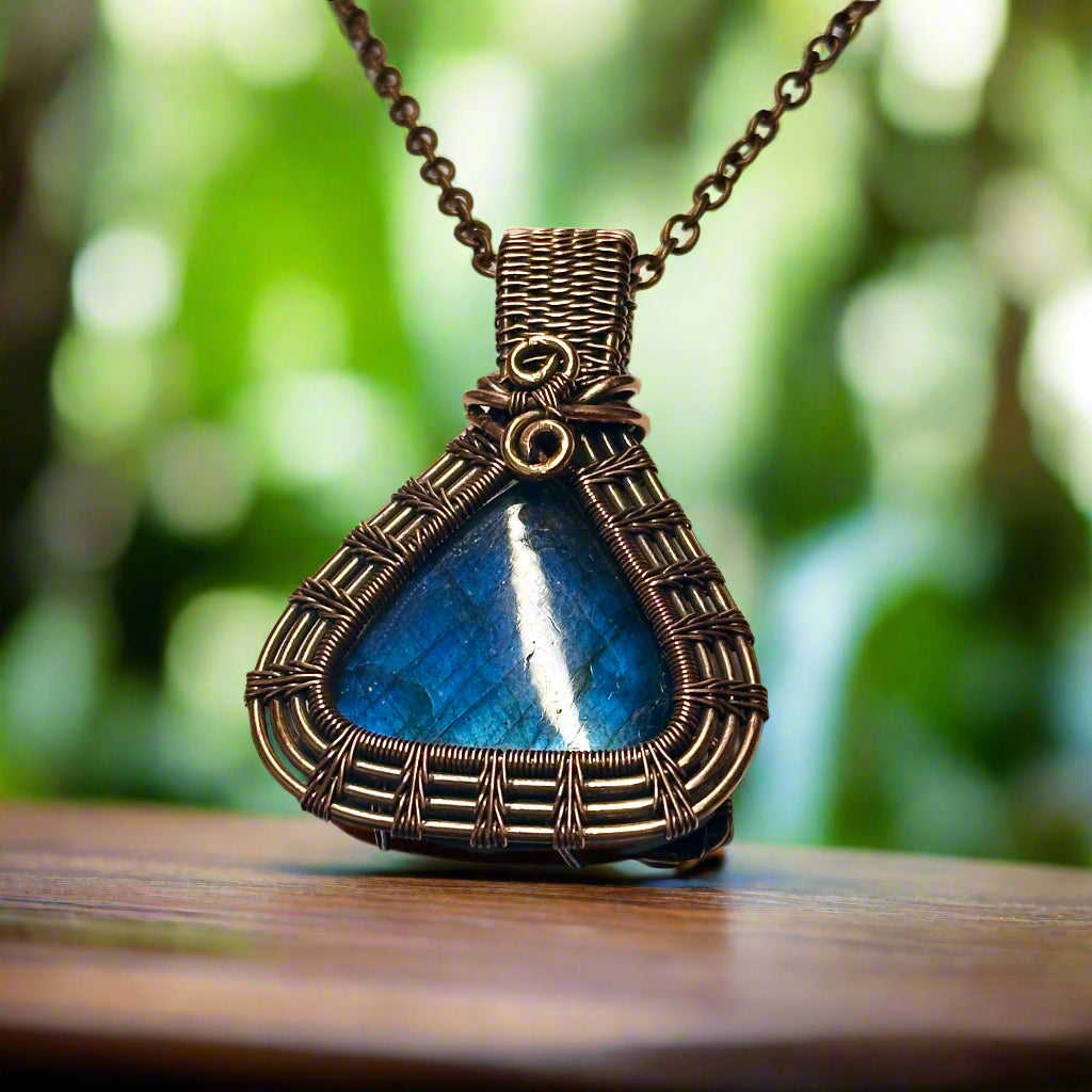 This handmade pendant features a bright blue flash triangle Labradorite wrapped in antiqued copper with intricate weaving pattern on the frame.