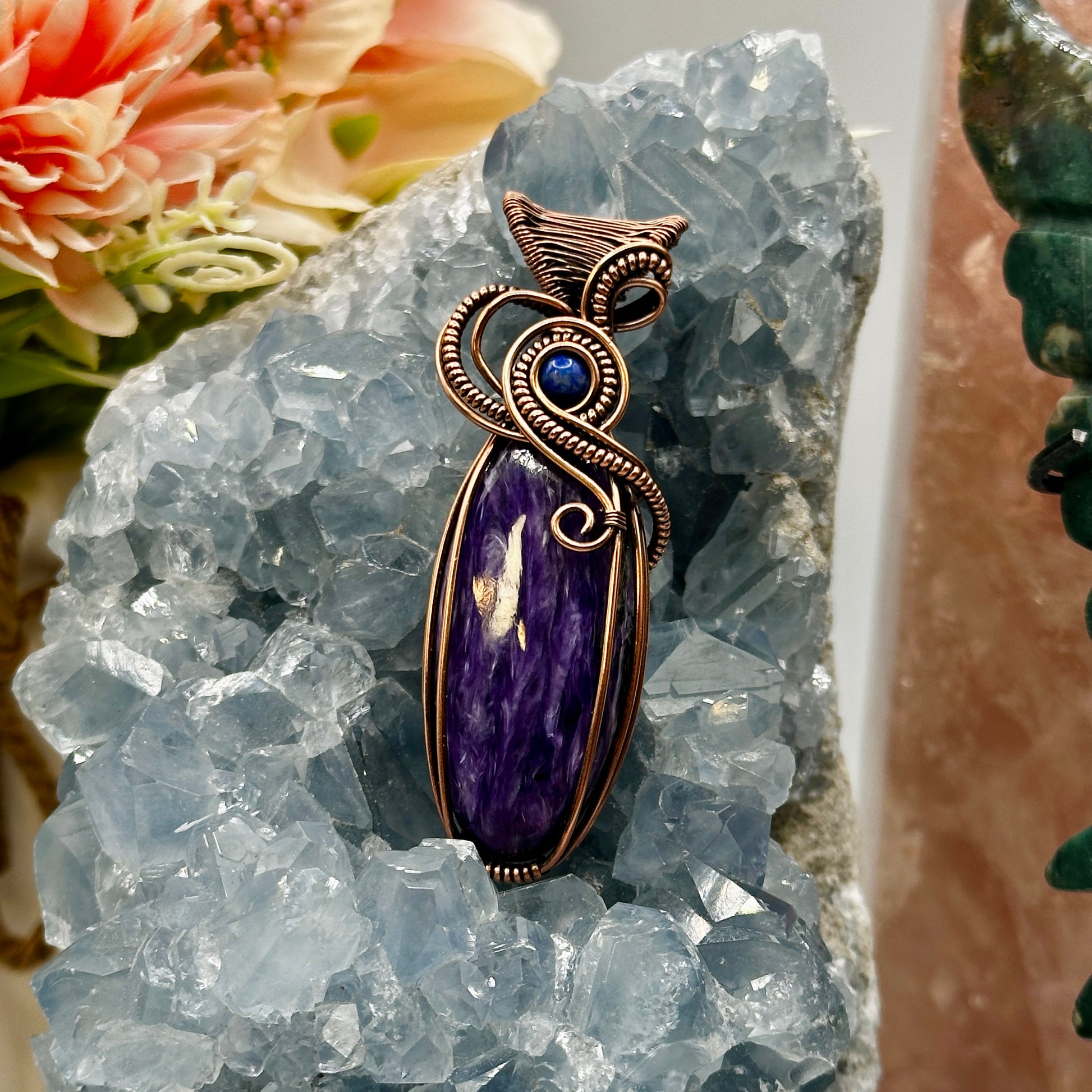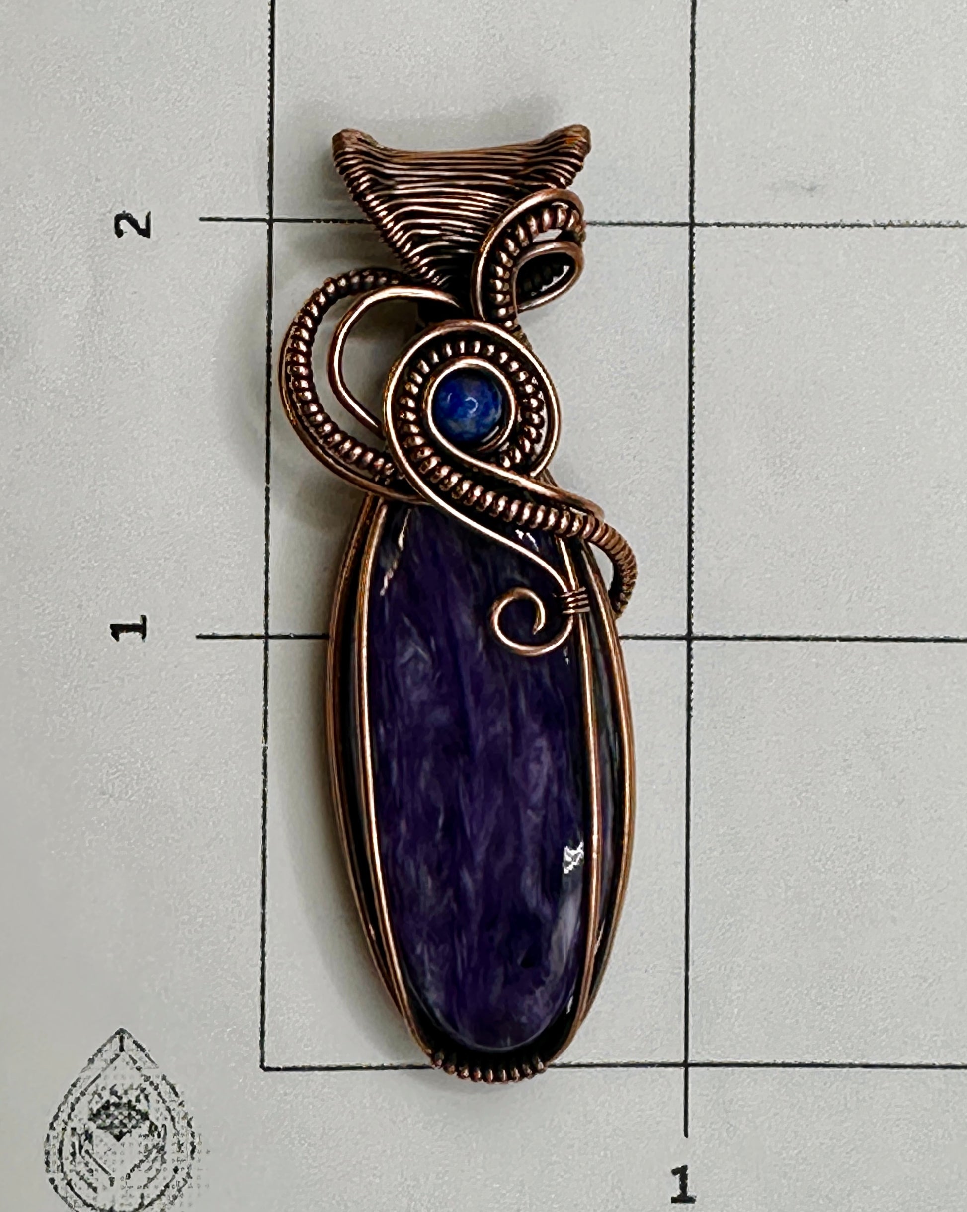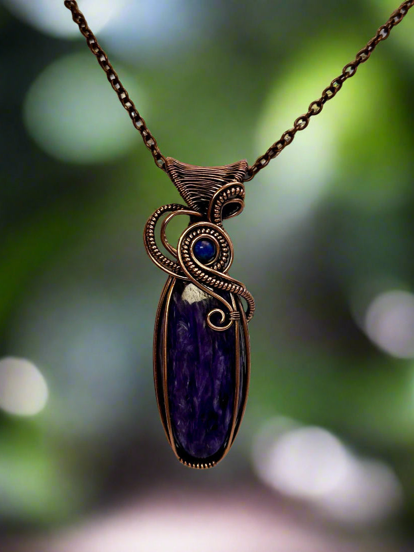 This handmade pendant features an oval Charoite wrapped in antiqued copper in a signature swirl design, accented with a sodalite bead.