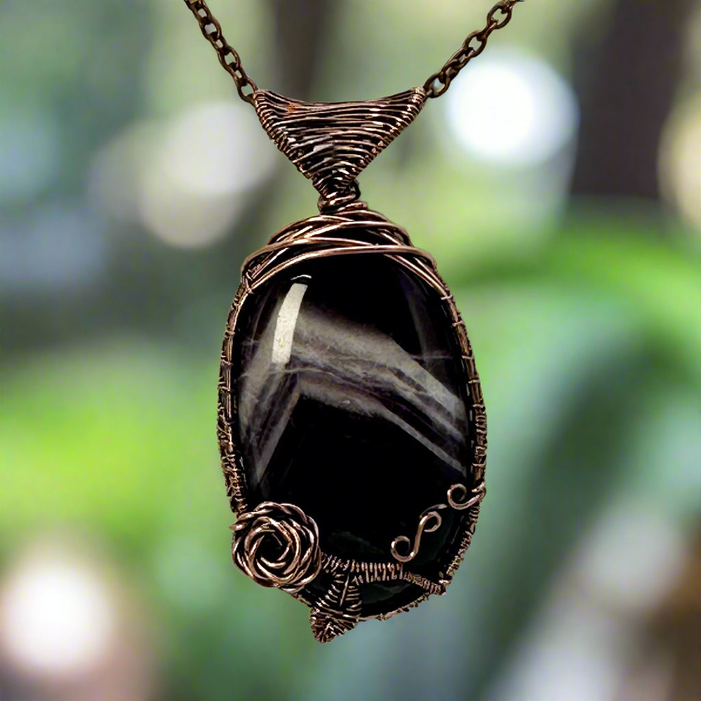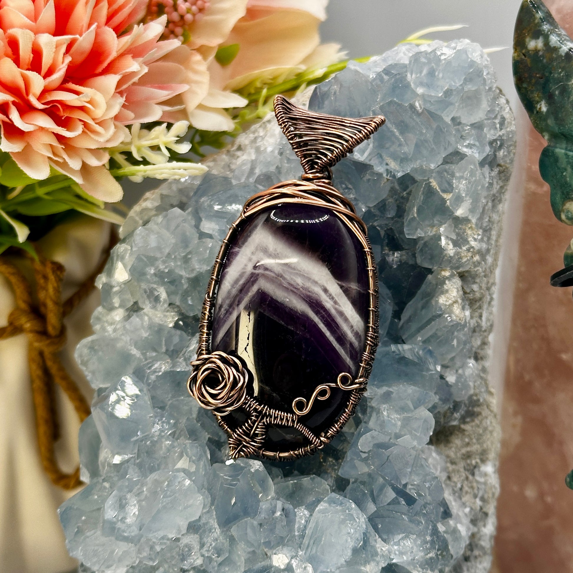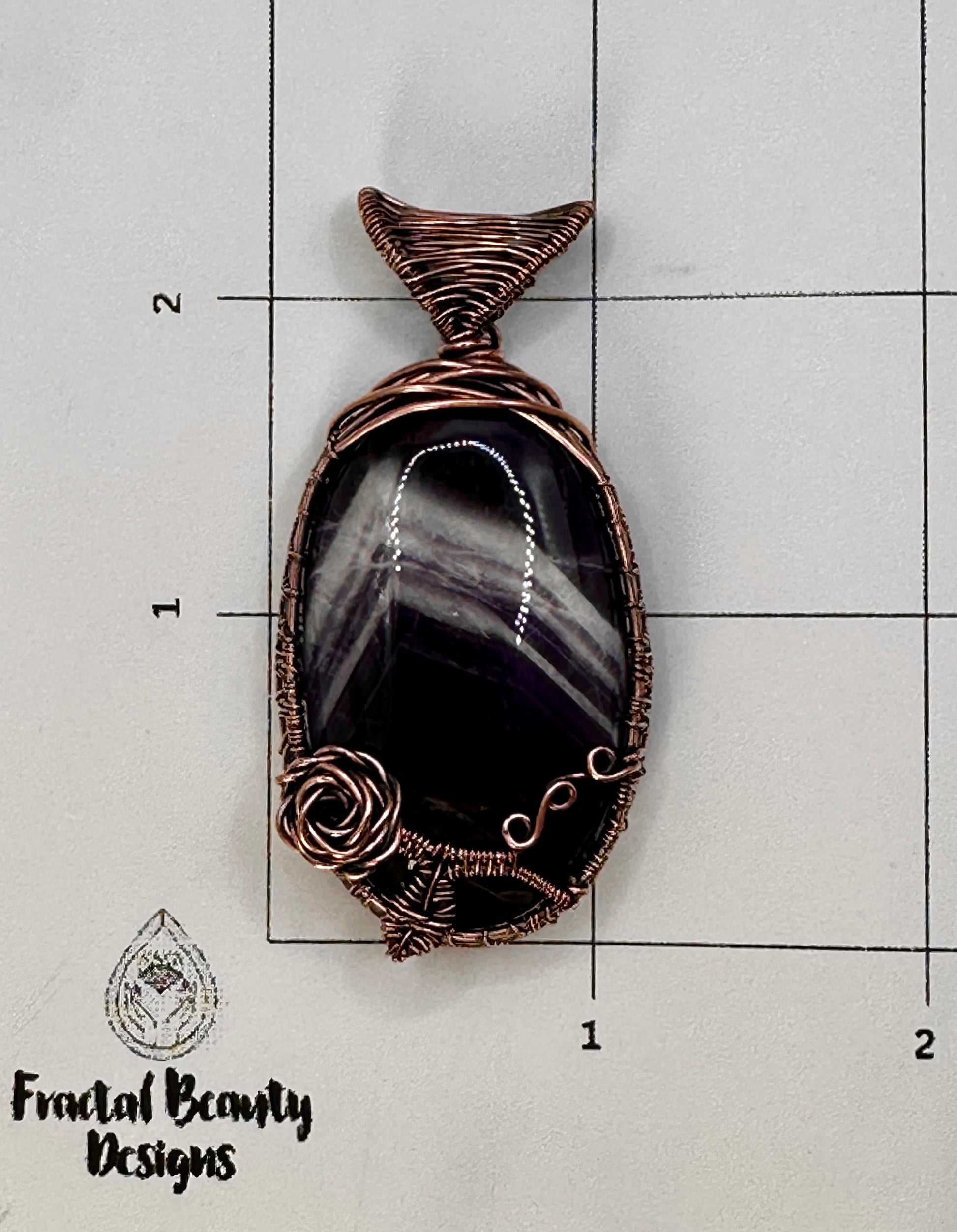 This handmade pendant features an large oval Chevron Amethyst wrapped in antiqued copper inside an intricately woven frame, featuring a wire wrapped rose with leaf and stem!