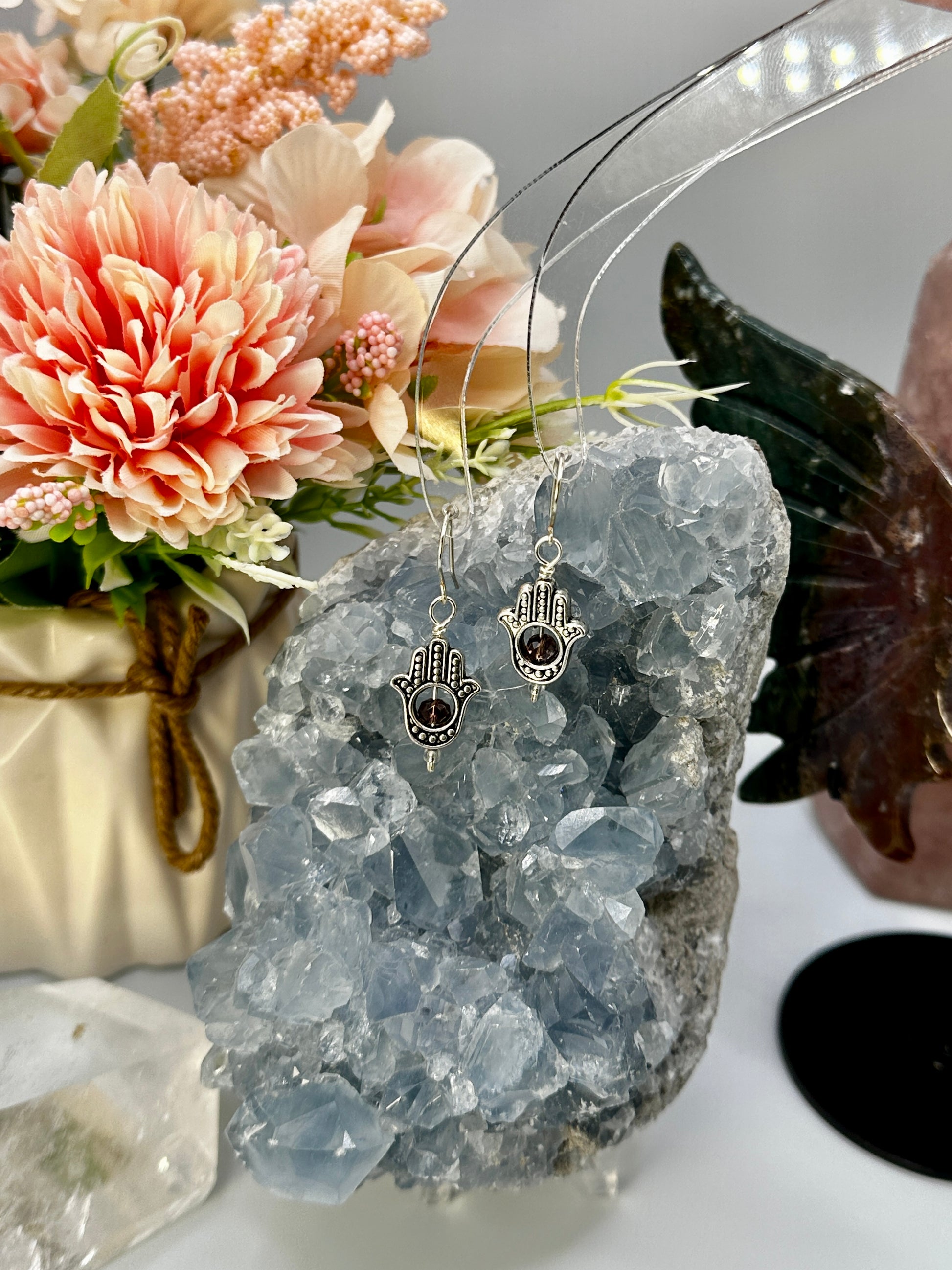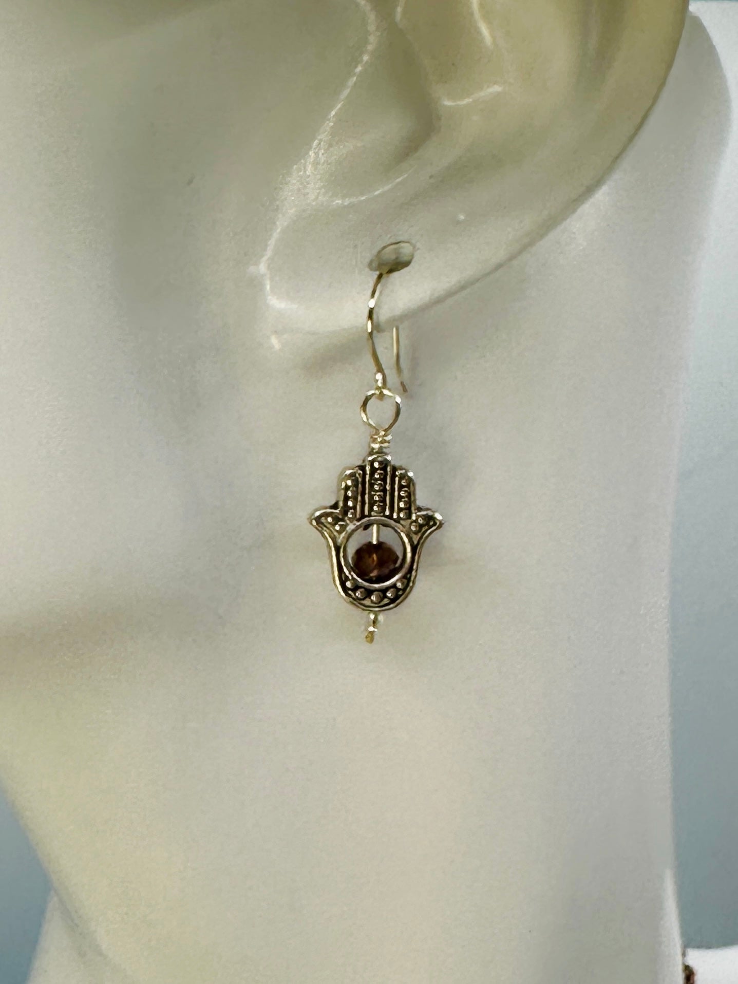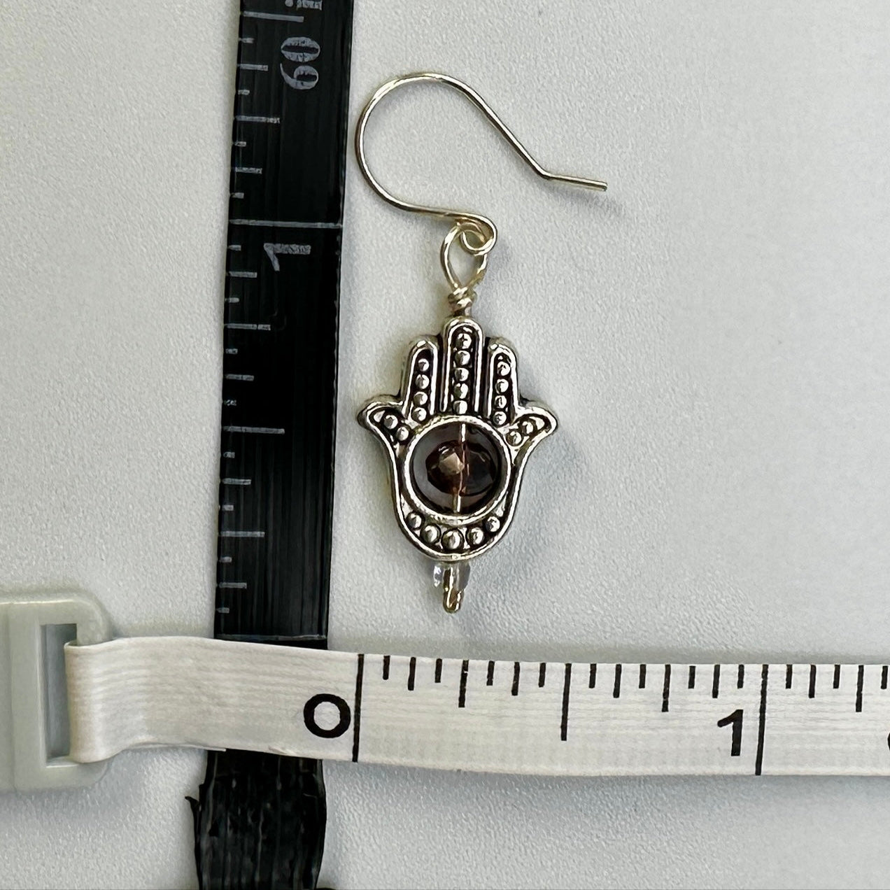 Simple Hamsa bead earrings in silver accented purple rondelle bead.