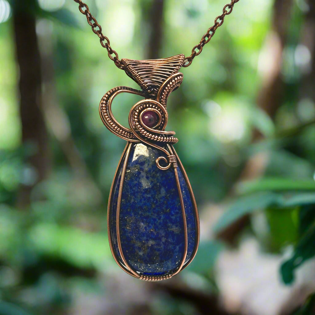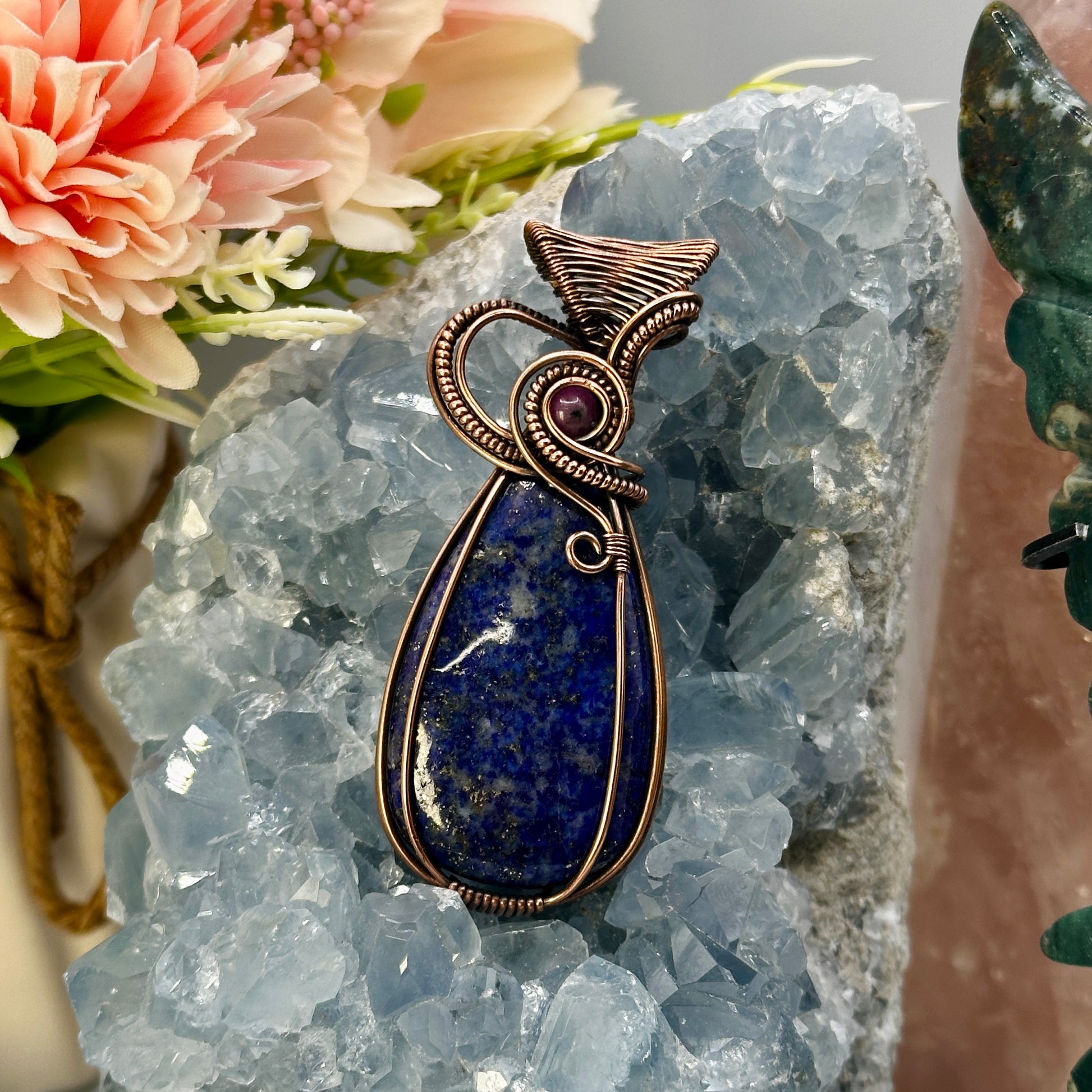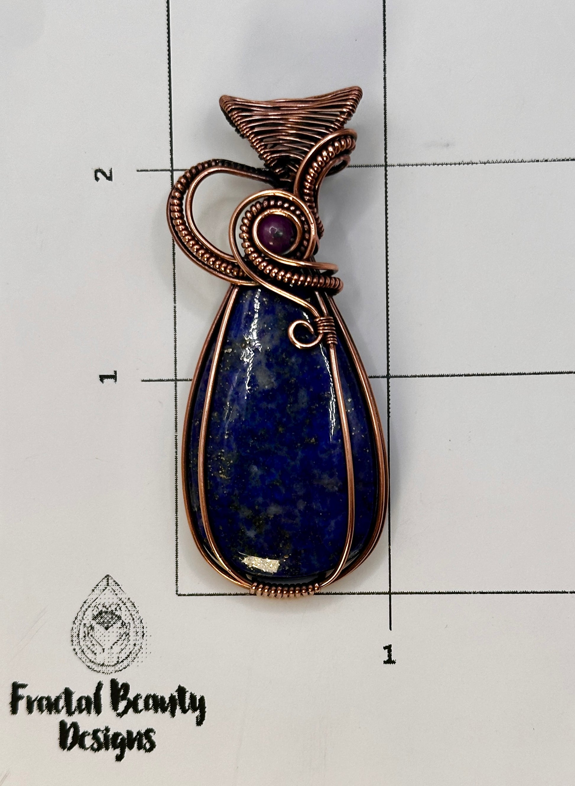 This handmade pendant features a gorgeous oval Lapis Lazuli wrapped in antiqued copper in a signature swirl design, accented with a ruby bead.