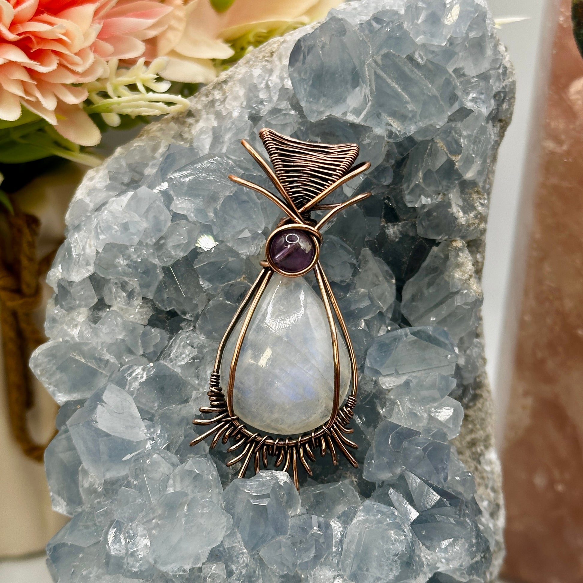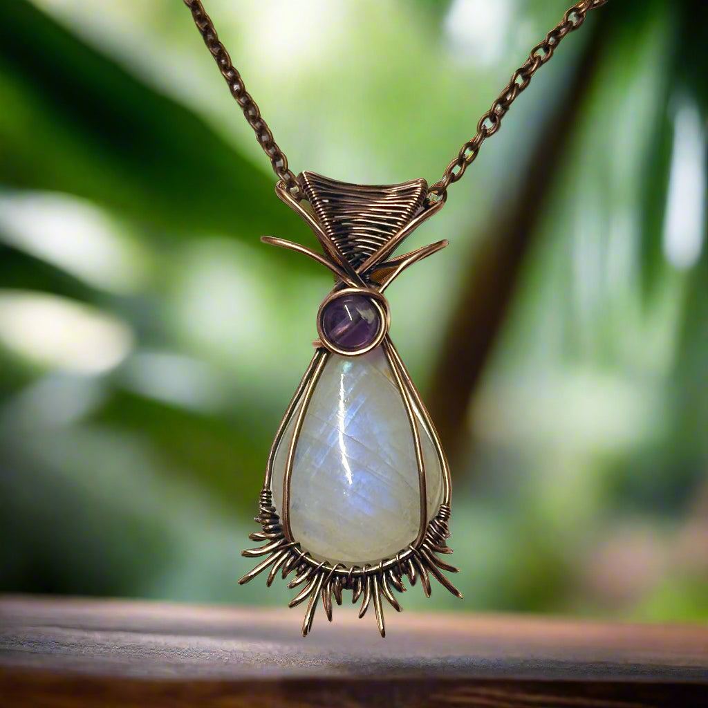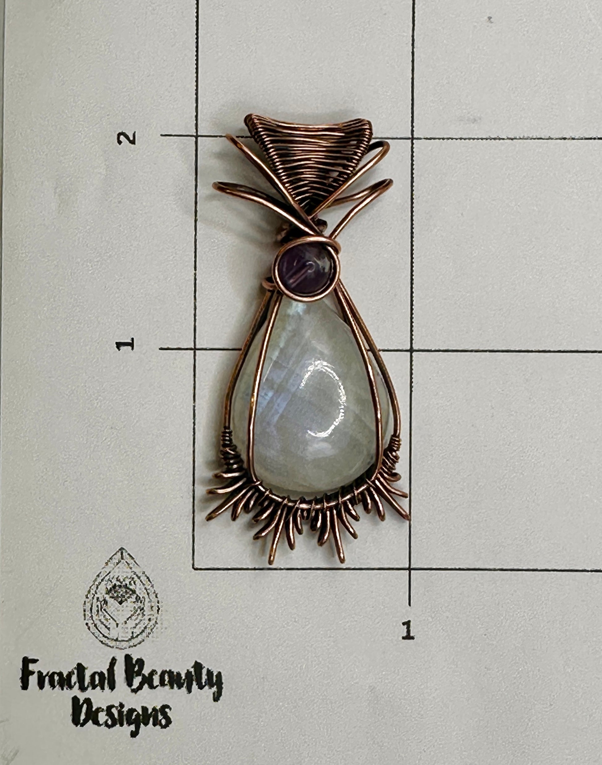 This handmade pendant features a tear-shaped Moonstone wrapped in antiqued copper in my signature "pineapple" design, accented with a amethyst bead.