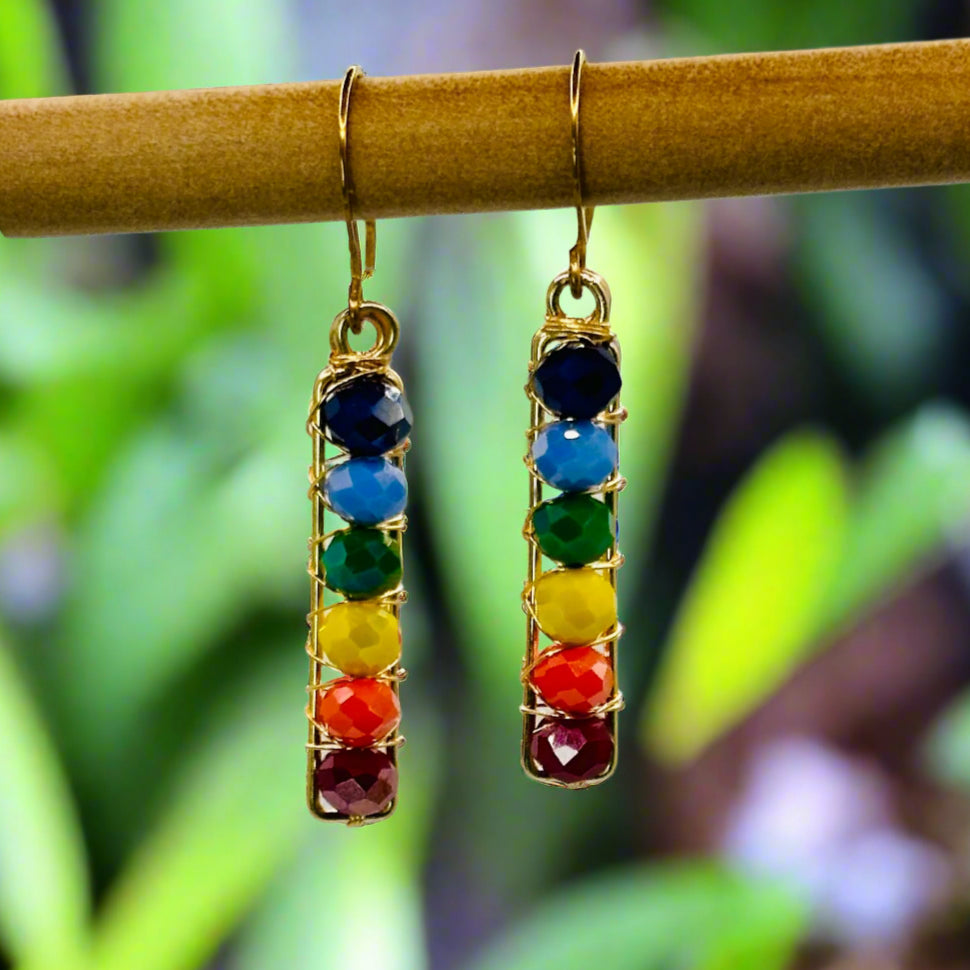 These rainbow bar earrings can be made in copper, silver, or gold color, your choice! With colorful rainbow faceted rondelle beads. Elevate your style with these versatile and eye-catching earrings!
