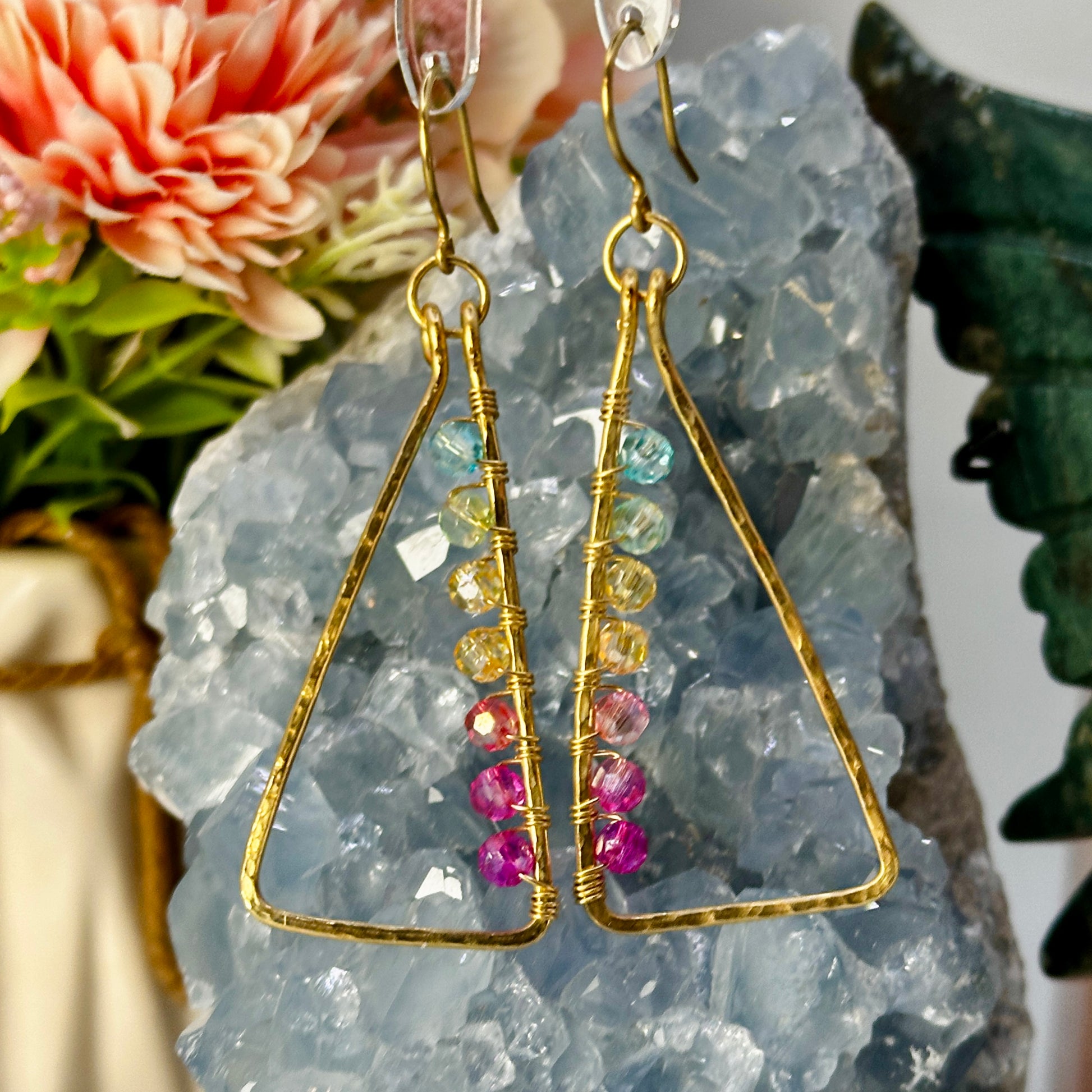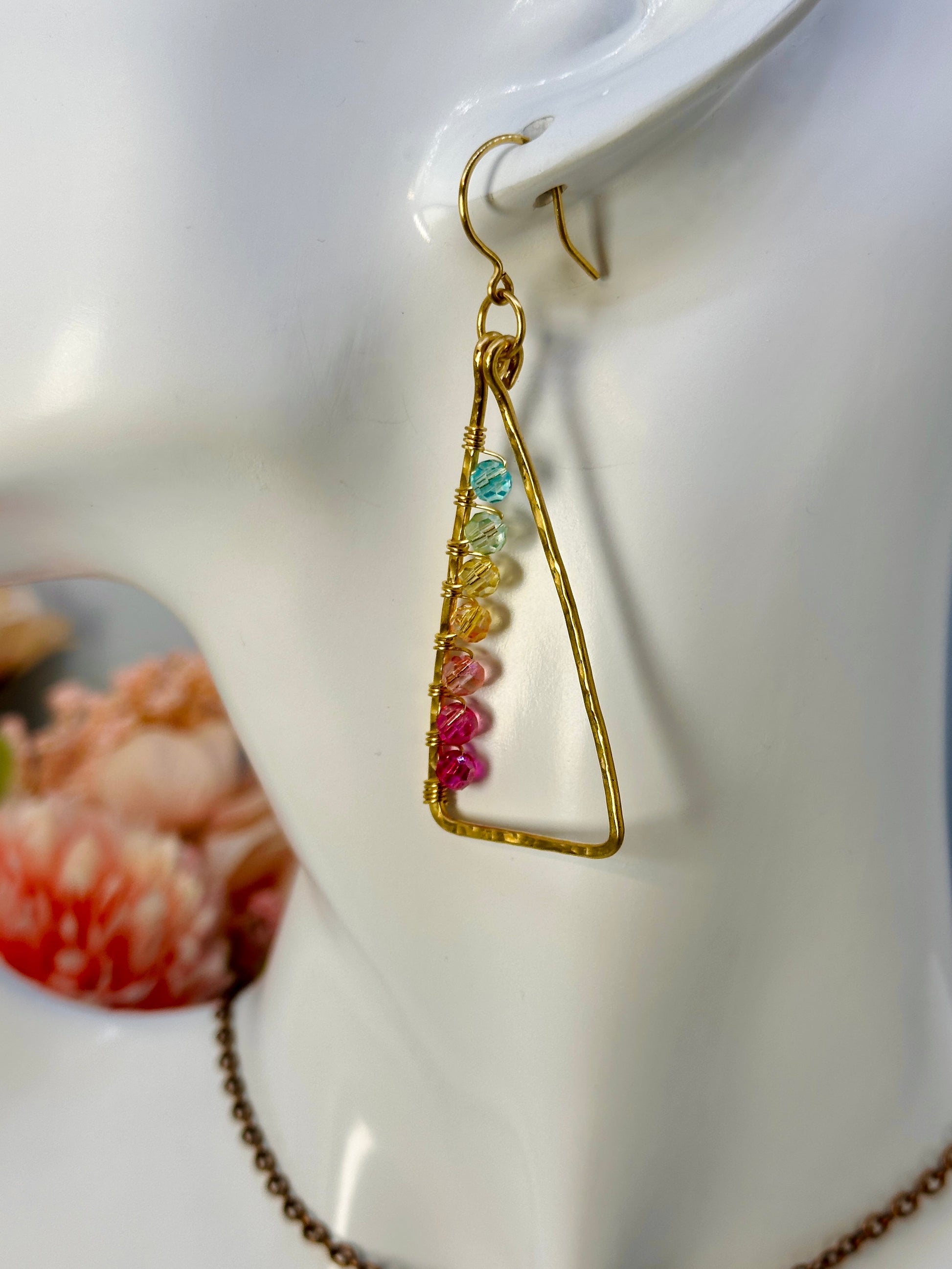 Add some color to your look with these stunning Rainbow Bead Triangle Earrings in Brass. Each earring features a triangle design accented with vibrant rainbow beads. Fun and unique, these earrings are perfect for adding a playful touch to any outfit.