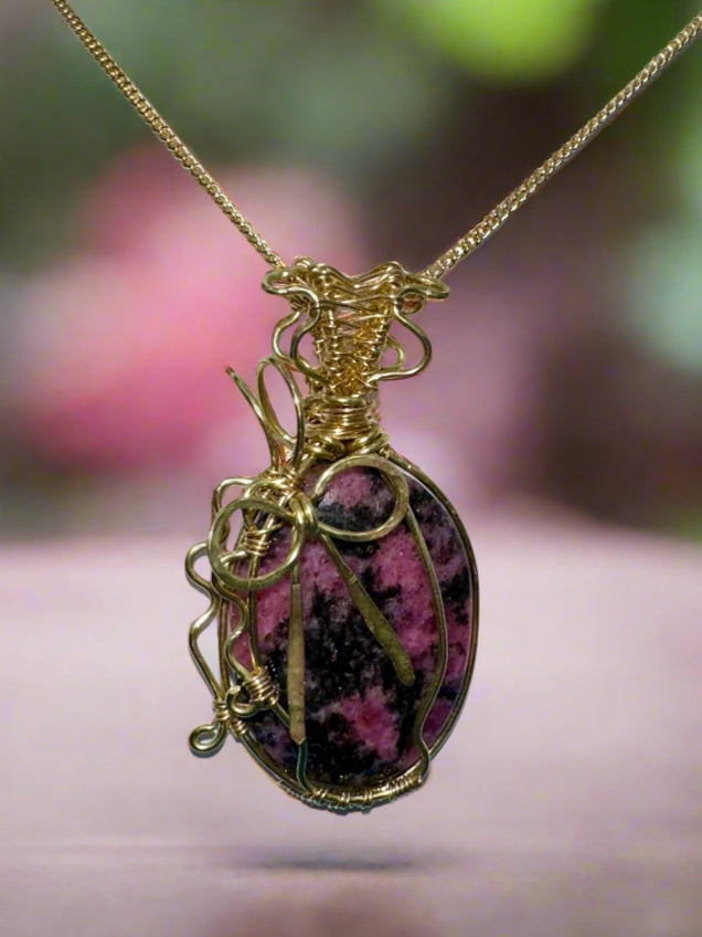 Oval Rhodonite wrapped in jeweler's brass, featuring a bow accent.