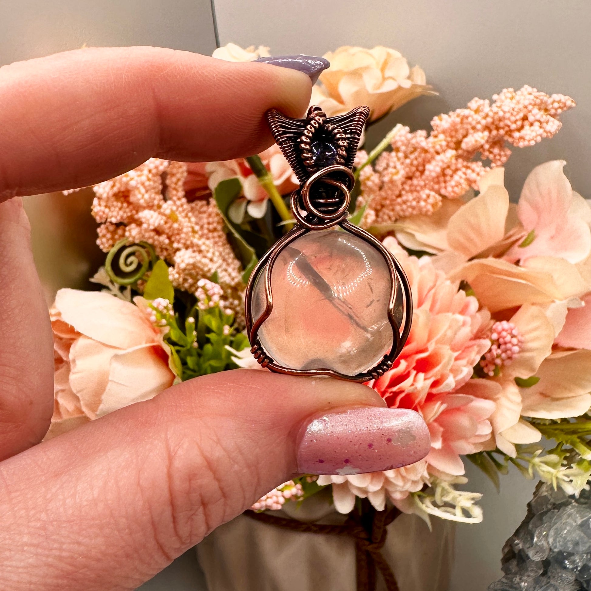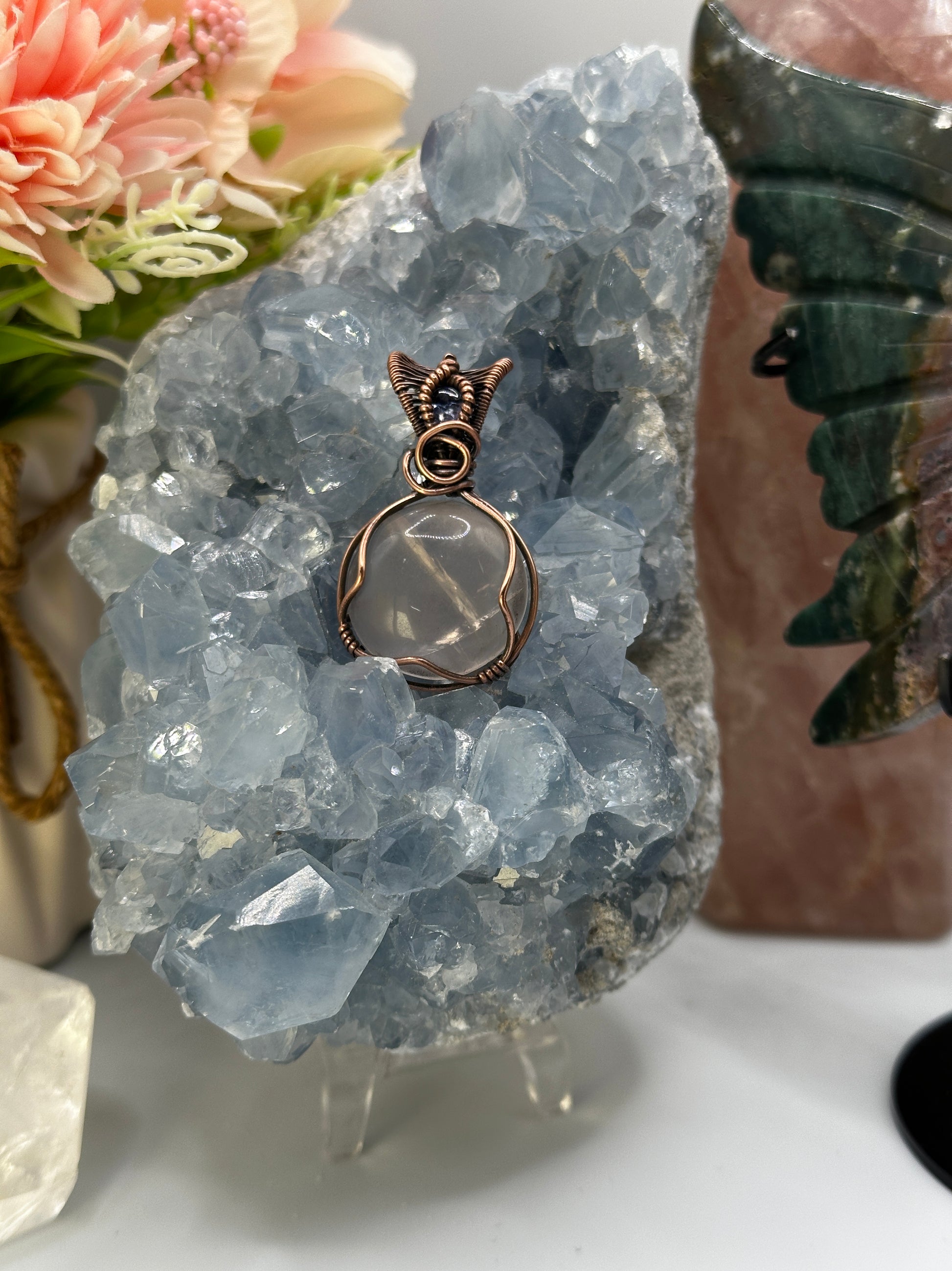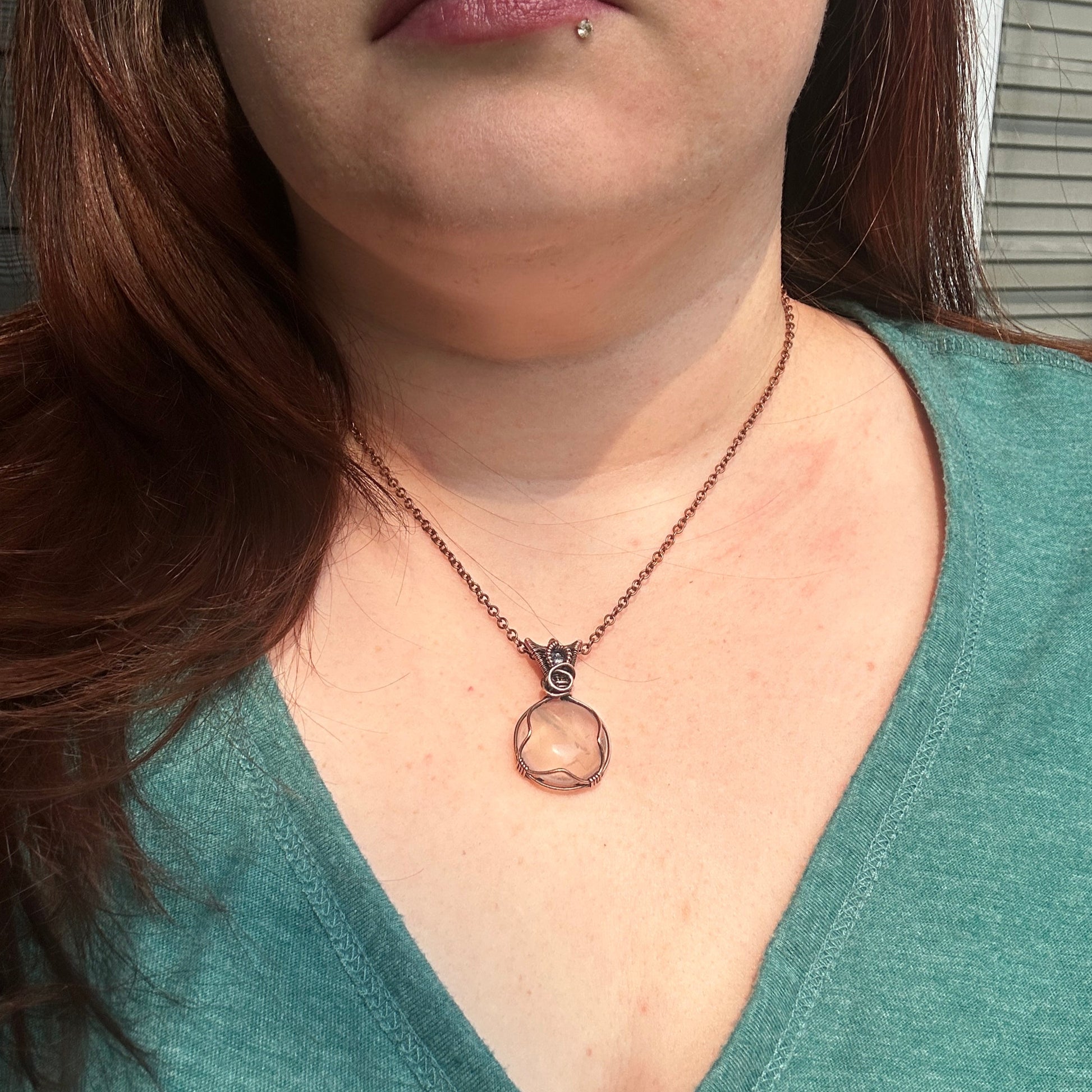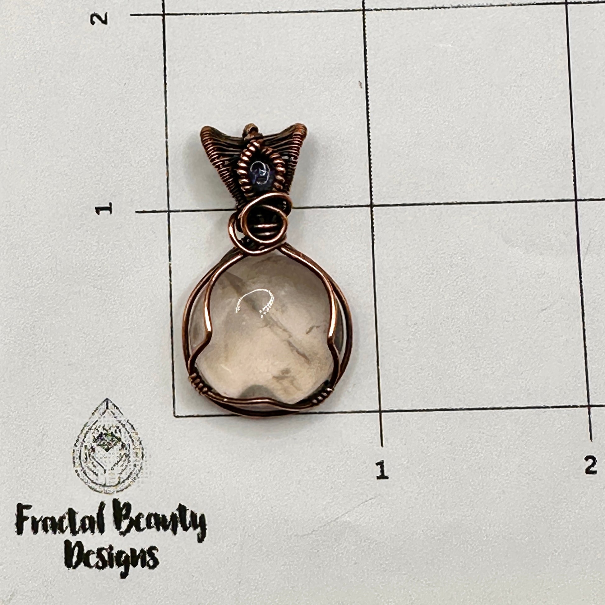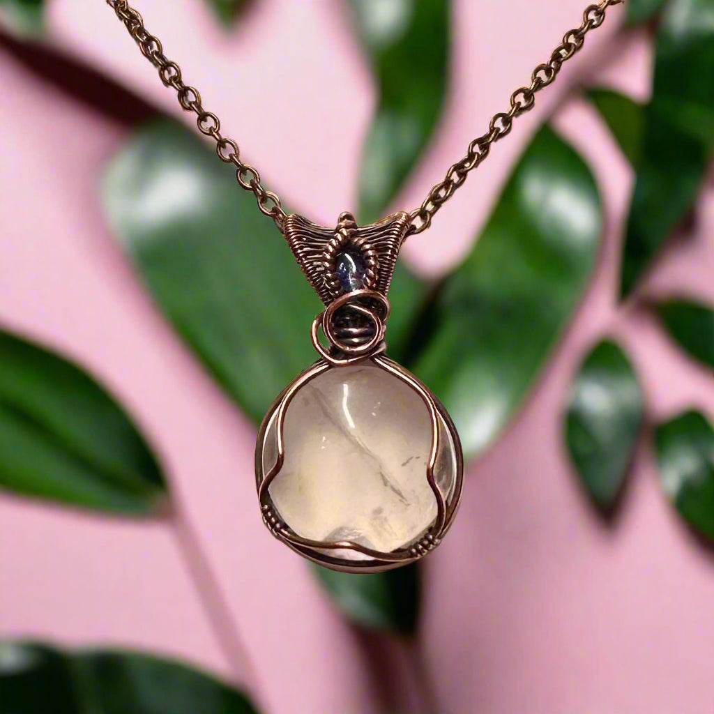 This dainty handmade pendant features a pale Rose Quartz stone, simply wrapped in antiqued copper accented with a tanzanite facet.