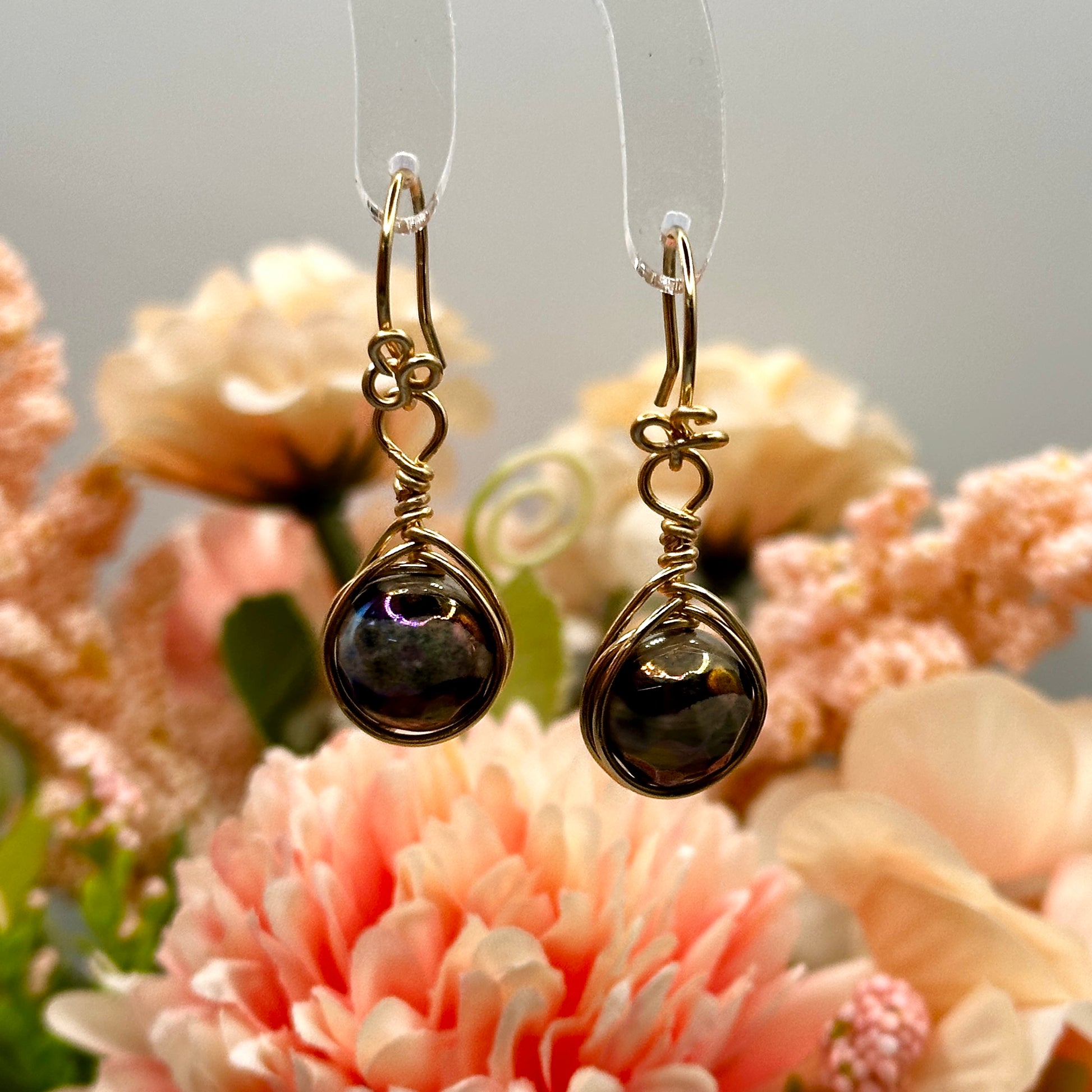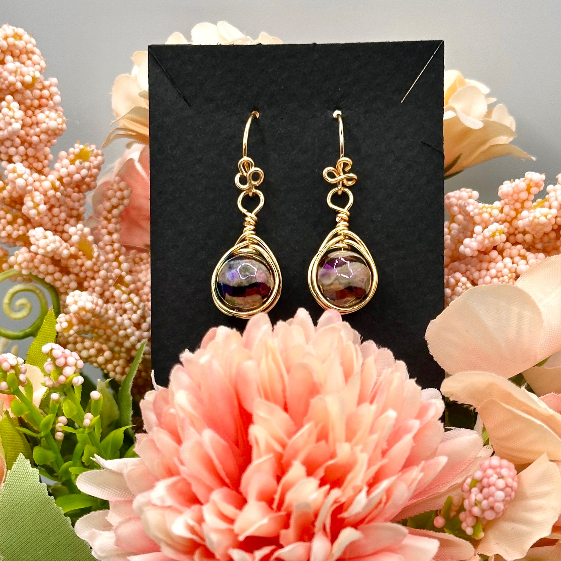 These simple classic dangle earrings are made with an earthy stone-like bead with an oil slick swoosh and a clover detail as part of the ear hooks. These can be made in copper, silver, or gold color wire.