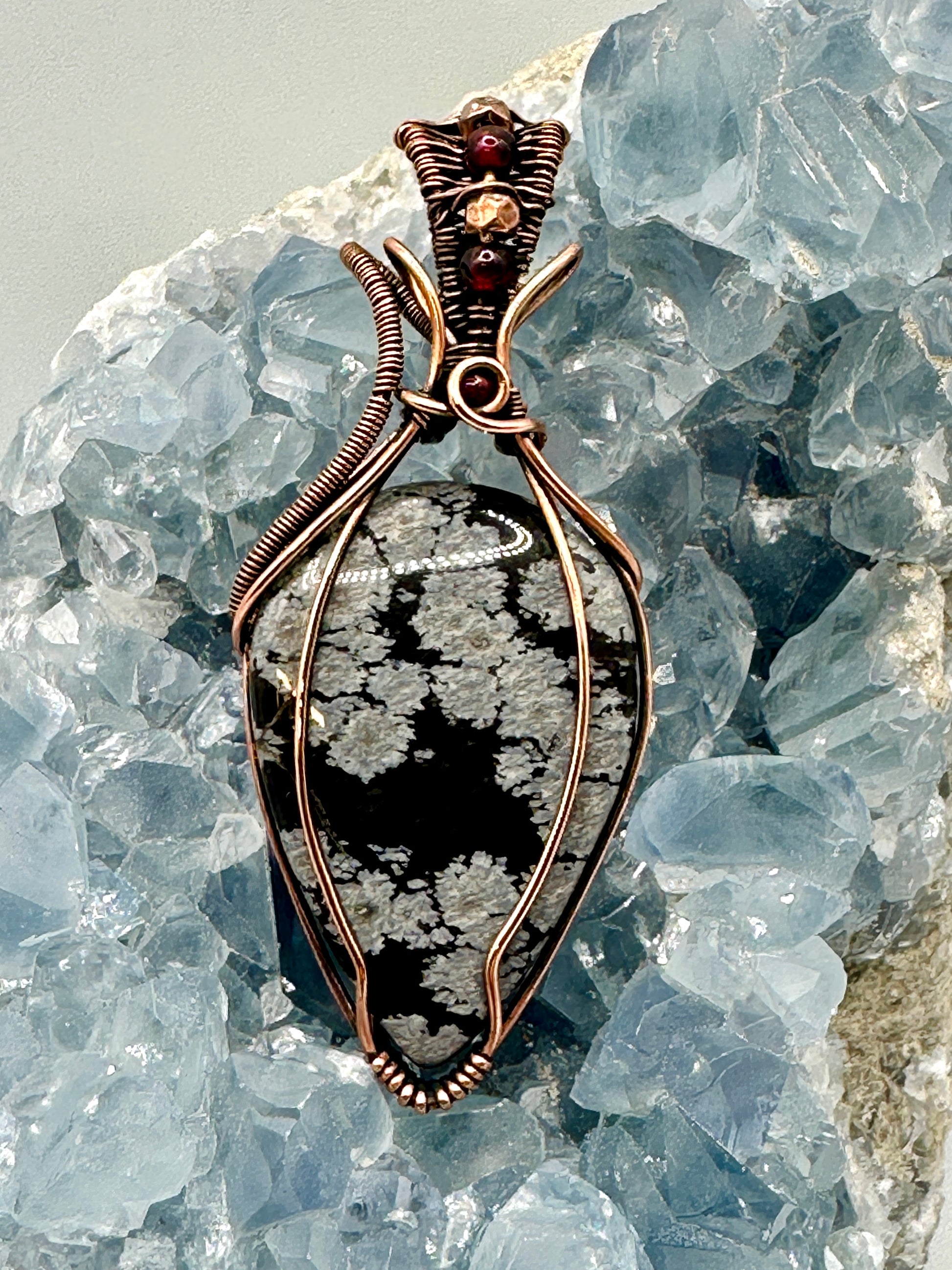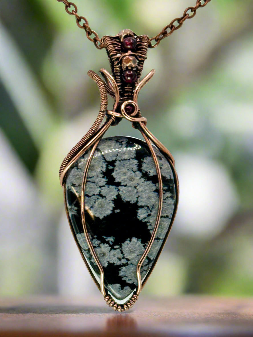 Pear shaped Snowflake Obsidian wrapped in antiqued copper, accented with garnet and copper beads.