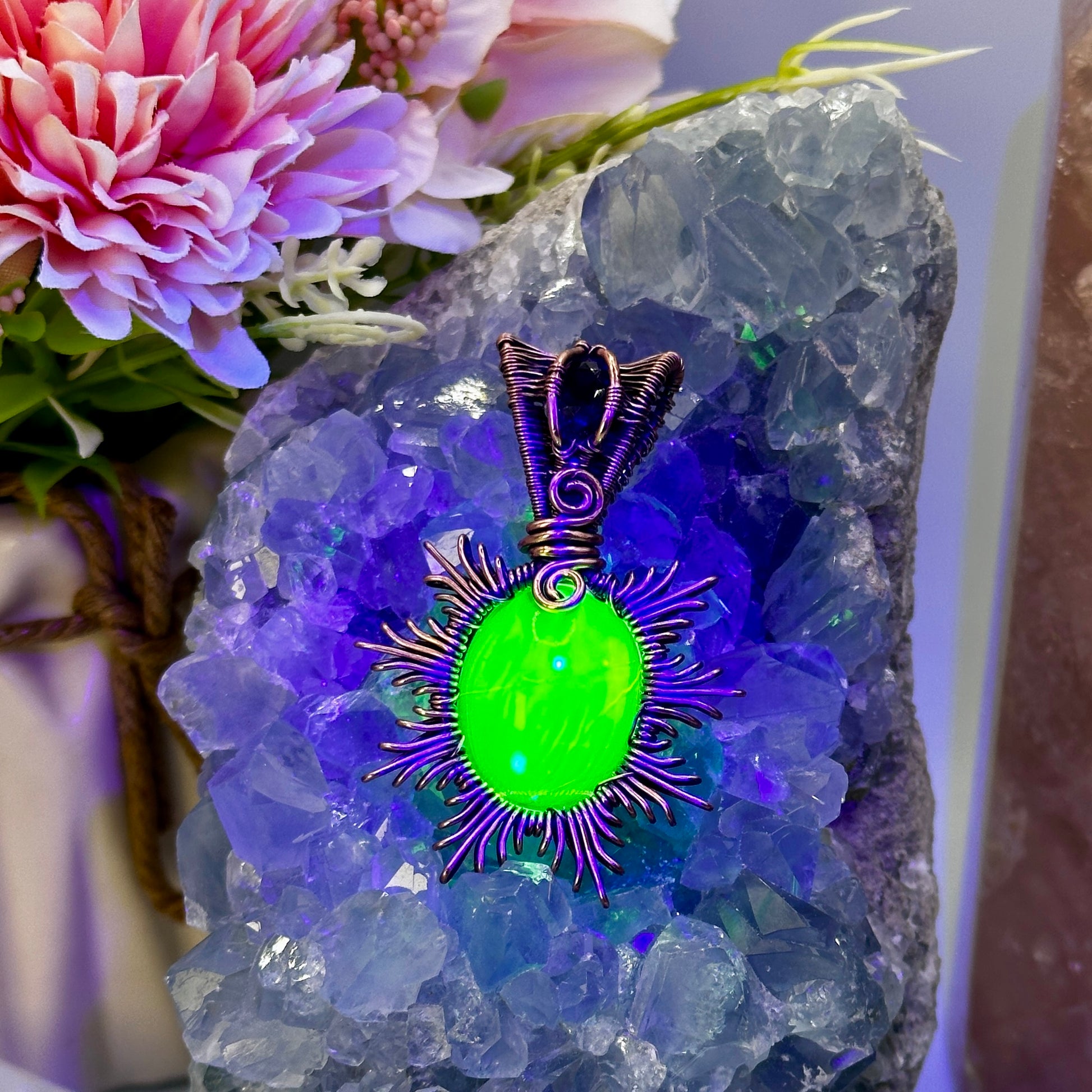 This pendant is made with authentic uranium glass, which contains trace amounts of uranium that cause its signature green glow under UV light. The radiation levels are extremely low—well below safety limits—and are not harmful to wear. However, as with any collectible containing naturally radioactive materials, please handle with care and store away from prolonged skin contact when not in use.