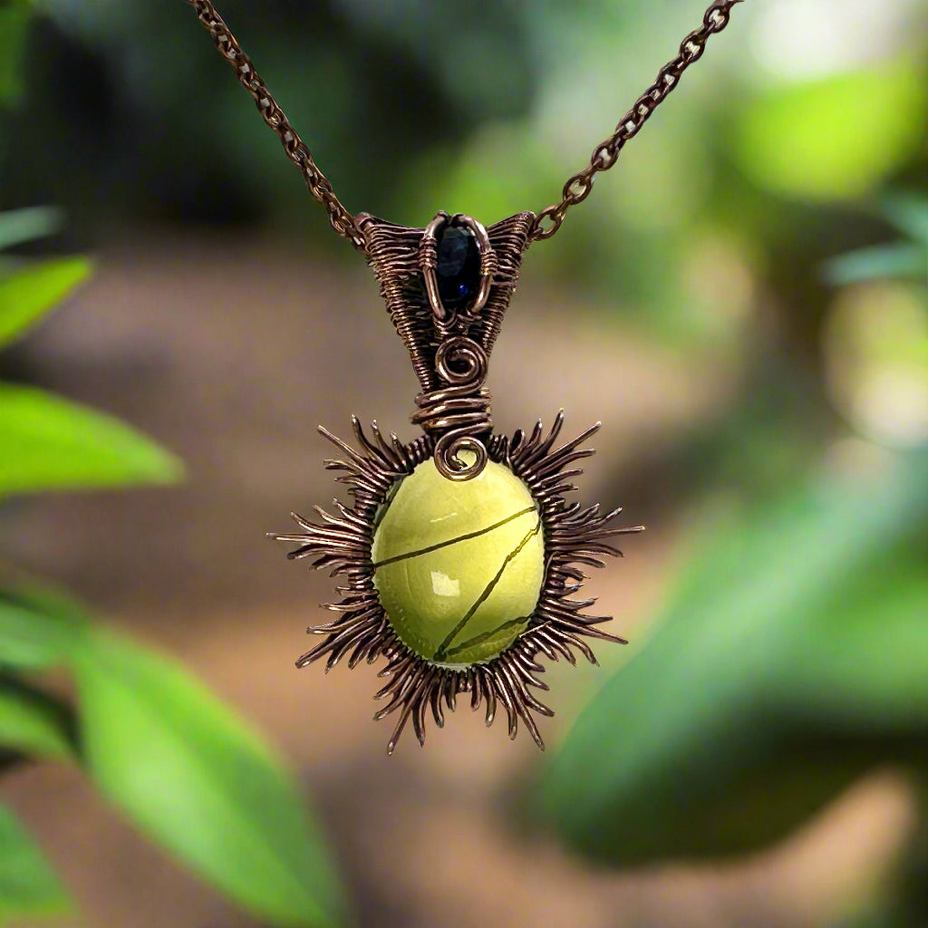 This handmade pendant features an oval Uranium Glass stone wrapped in antiqued copper in a sunburst design, featuring an iolite stone facet in the bail--iolite is a deep purplish blue color. This is high quality vaseline glass which is a brighter yellow-green color and glows almost painfully bright under 395 NM UV light!
