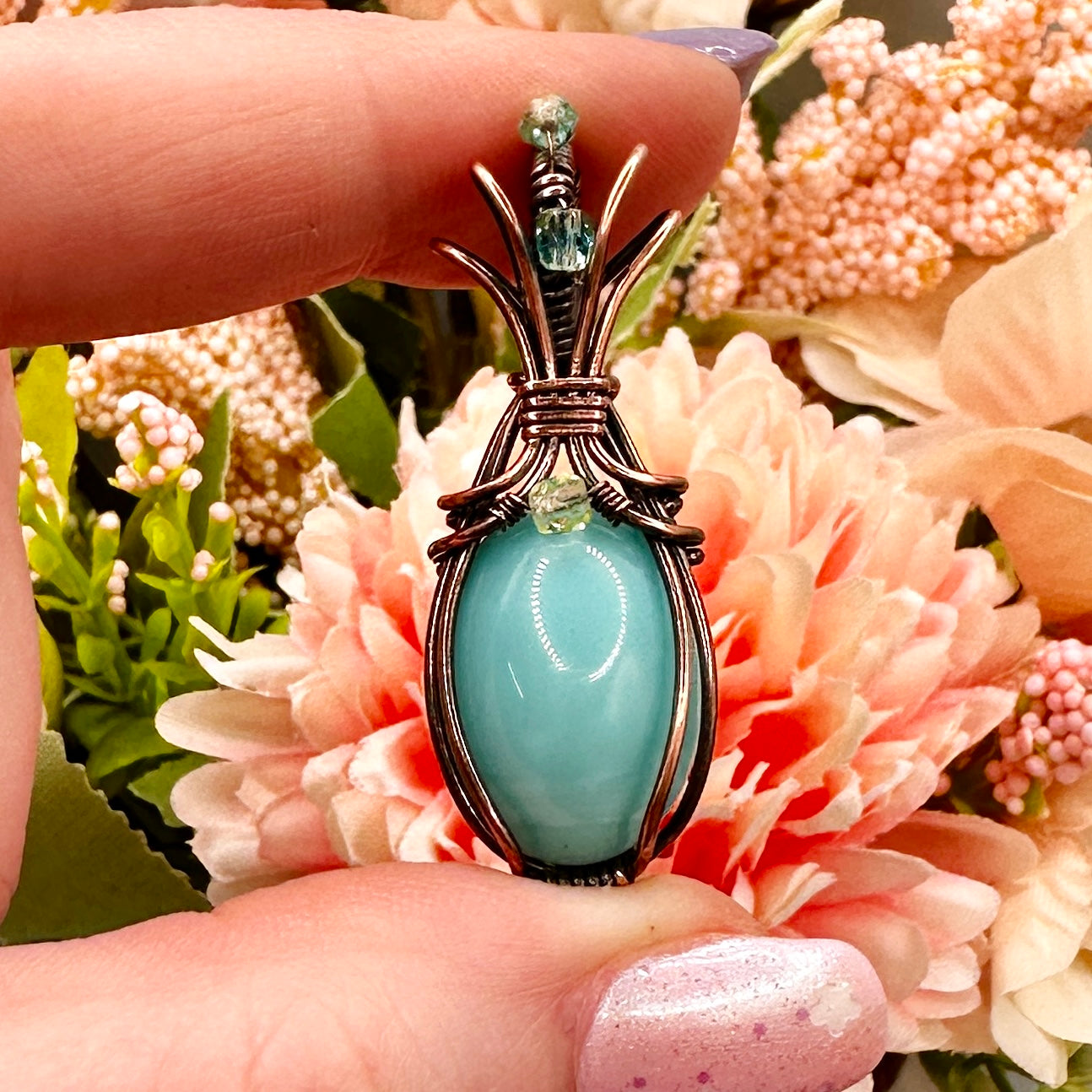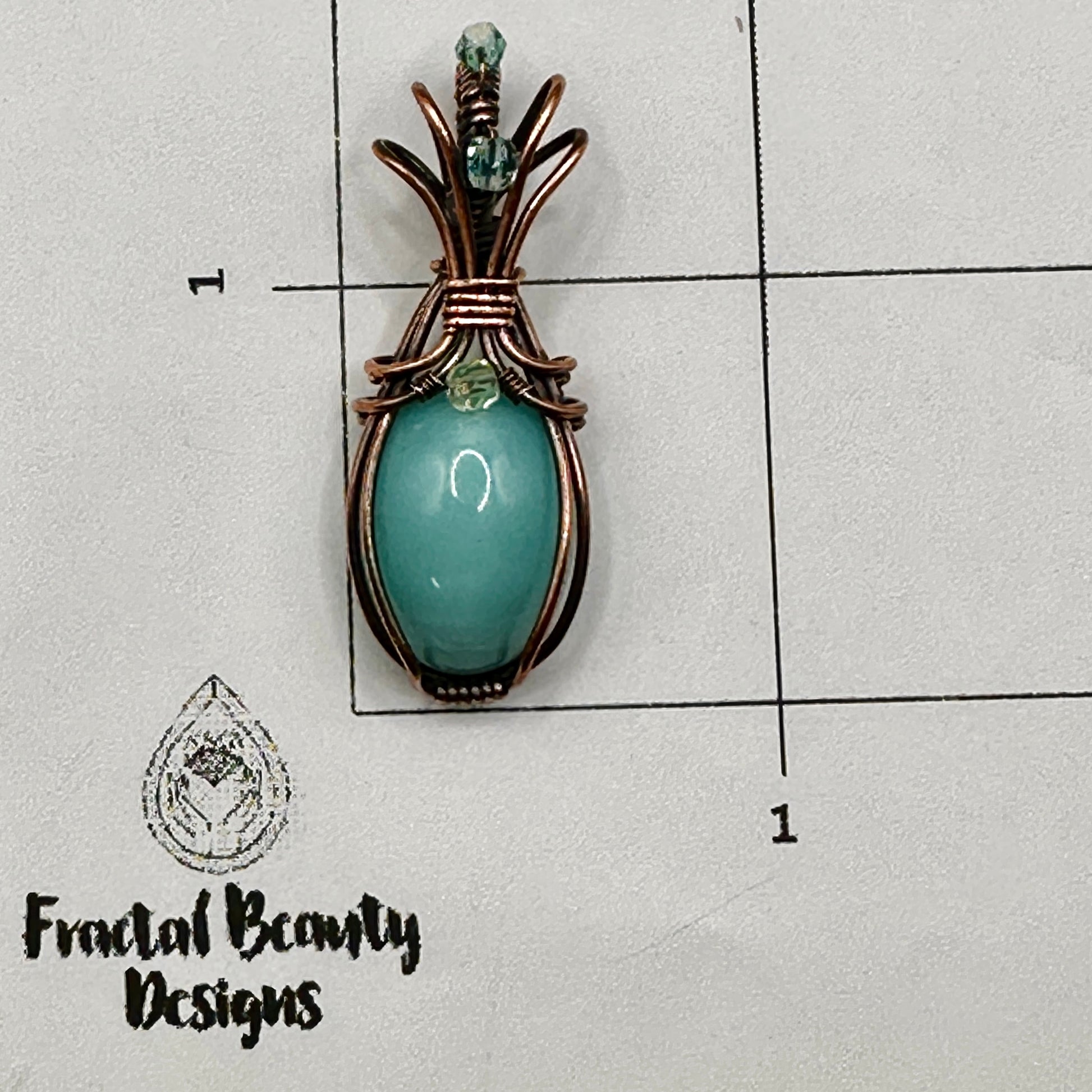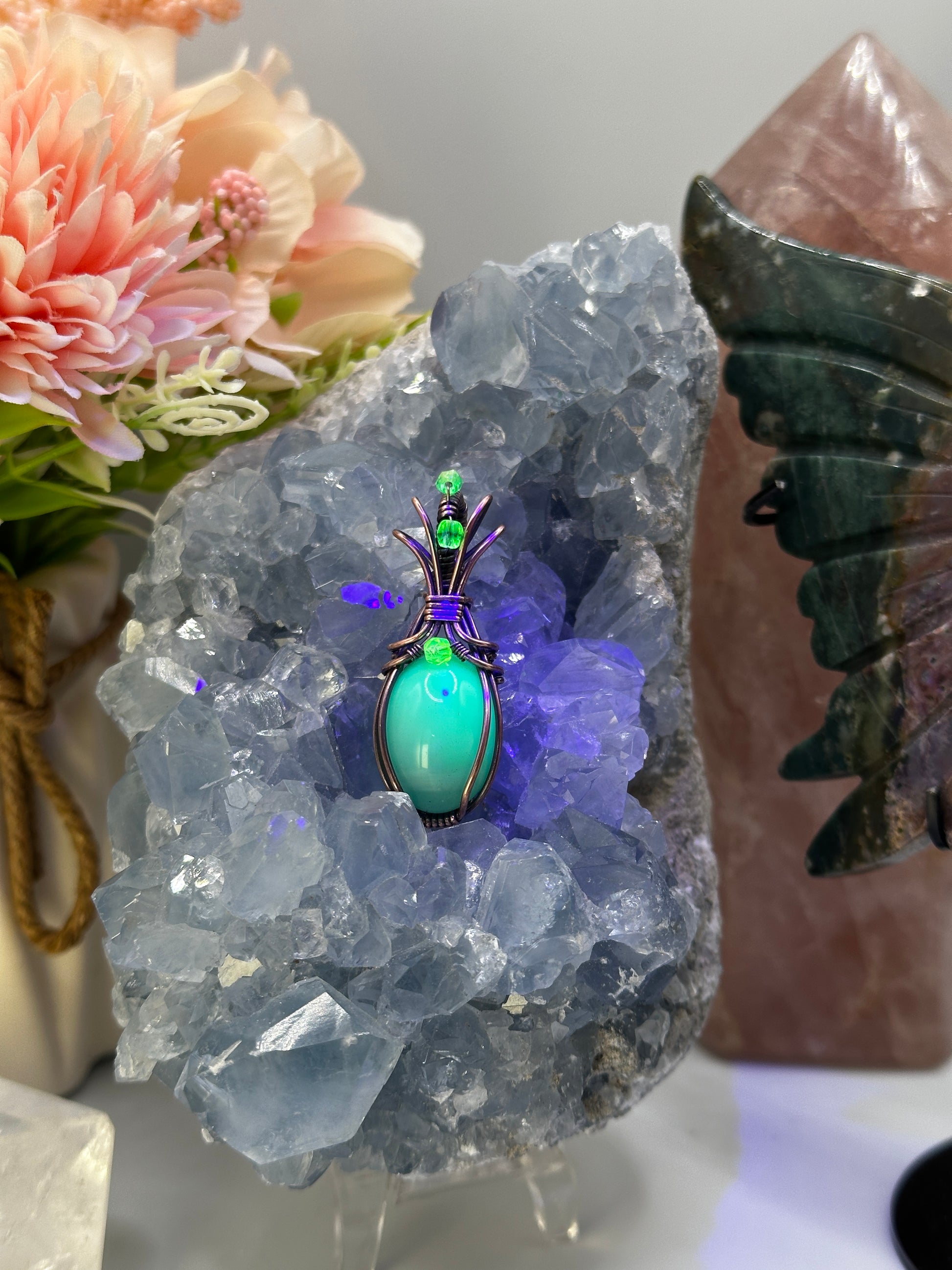 This handmade pendant features an oval Vintage Blue Uranium Glass stone wrapped in antiqued copper in my "art deco" design, featuring blue-green uranium glass beads. This pendant has that classic uranium glow under UV light in the main stone as well as the beads!